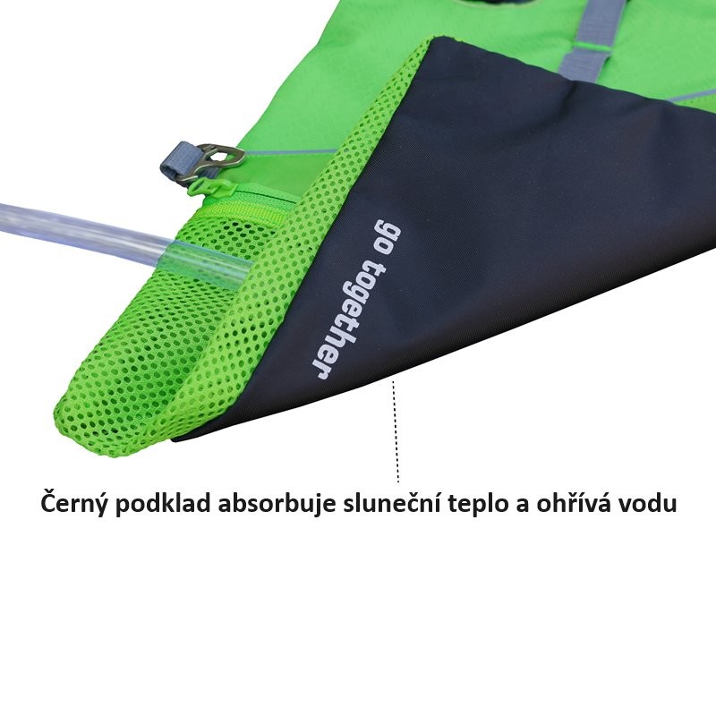 Na naplnenie otvorte skrutkovací uzáver na prednej strane vrecka a naplňte mech vodou. Ak plánujete ohrievať vodu, budete musieť predtým mech vybrať z vrecka na jeho naplnenie. Po naplnení môžete naplnený mech položiť na slnko alebo zavesiť. Nikdy nezabudnite otestovať teplotu vody predtým, ako ju použijete na svojom šteniatku alebo psovi. Zaveste sprchovú tašku na požadované miesto pomocou popruhu alebo rukoväte v hornej časti tašky. Uistite sa, že vrecko je zavesené dostatočne vysoko, aby hadica smerovala nadol. Tým sa zabezpečí správny prietok vody. Ak chcete vypustiť vodu, vytiahnite sivú sprchovú hlavicu smerom von. Ak chcete zastaviť vodu, zatlačte sivú sprchovú hlavica dovnútra. Na uloženie zaistite hadicu pomocou suchého zipsu na boku vreckaa uistite sa, že sprchová hlavica smeruje nahor. Ak chcete mech na vodu vysušiť, otvorte skrutkovací uzáver na prednej strane a zaveste ho na sušenie. Hadica sa môže tiež odstrániť, aby sa urýchlilo jej sušenie. Ak je hadica ohnutá, pred prvým použitím ju umiestnite naplocho na teplé miesto.