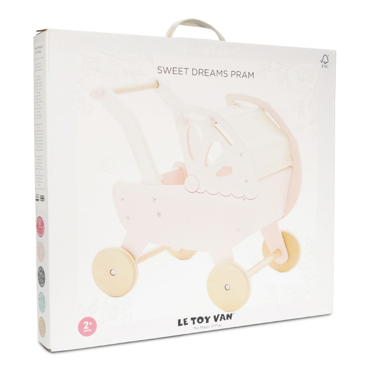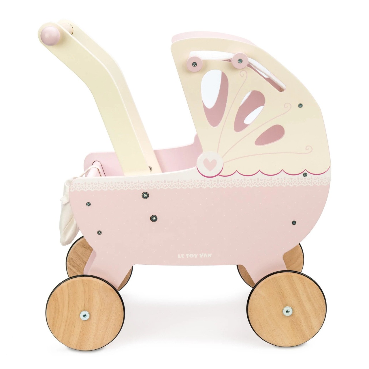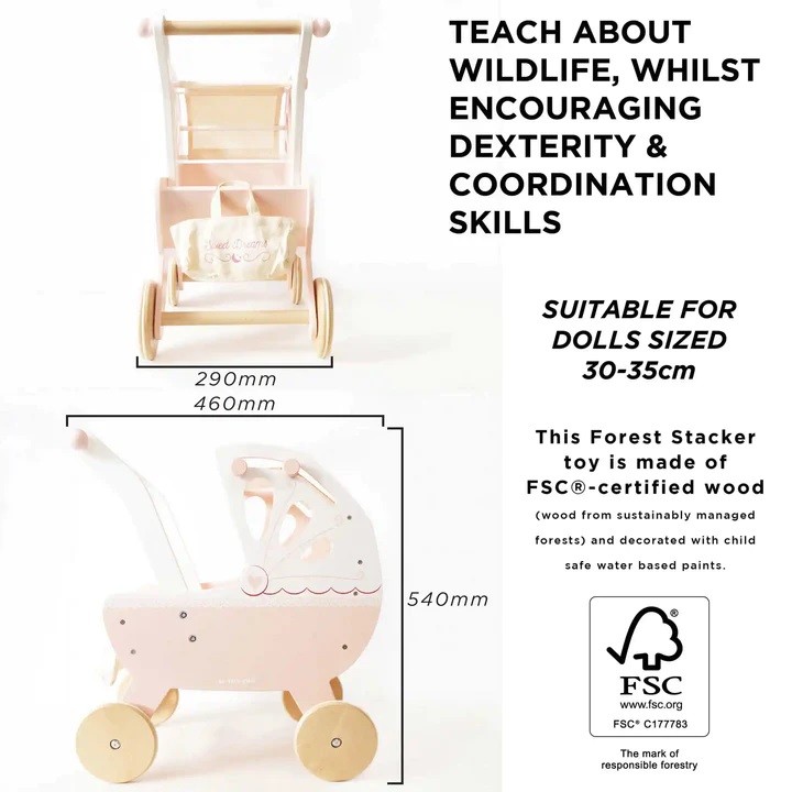 Vezměte panenku na procházku v tradičním dřevěném kočárku. Má krásný design plný nostalgie a jemné zdobení. Barevná paleta zahrnuje pastelově růžovou, krémovou a bílou. Kočárek má silnou konstrukci, měkkou matraci a unikátní zatahovací baldachýn, je perfektní pro panenky i plyšáky.Je vyroben z kaučukového masivu a dalších kvalitních materiálů, pogumovaná kolečka zajišťují plynulý pohyb po podlaze i koberci. V balení také roztomilá přebalovací taška.Kočárek je vyroben z FSC dřeva, malován je barvami na bázi vody, které jsou bezpečné pro děti.Představivá hračka, kterou si můžete předávat z generace na generaci. K postýlce se krásně hodí postýlka Sleigh a jídelní židlička, které najdete v záložce „příslušenství“. Hračky s účelemVšechny hračky firmy Le Toy Van jsou vyrobeny s cílem – aby dlouho vydržely. Designovány s láskou zkušenými řemeslníky za použití etických praktik a udržitelných materiálů, které jsou laskavější k naší planetě. Hlavní vlastnosti: FSC dřevodesignováno v Londýněvhodné pro hračky ve velikosti 30-35 cmvyrobeno eticky z udržitelného dřevatestováno dle nejpřísnějších standardůmalováno netoxickými barvami na bázi vodyinspiruje k představivé hřeasistuje v rozvoji sociálních dovedností a řečipo rozbalení nutno složit dle návodu Ocenění hračky:Loved By Parents Shortlisted Award 2018 Honeybake kolekce: Hračky v této kolekci jsou vhodné k objevování, pomohou dětem s rozvojem představivosti, sociálních a verbálních dovedností a kognitivních funkcí. Tradiční design s moderními detaily děti jistě bude bavit. Honeybake je kolekce Le Toy Van, která vyhrála nejvíce ocenění, a to za design, kvalitu, bezpečnost a také za vzdělávací a herní hodnotu. Značka a certifikát FSC® (Forest Stewardship Council) zaručuje, že dřevo, ze kterého byl produkt vyroben, nebylo vytěženo nelegálně a pochází z lesů obhospodařovaných šetrným či přírodě blízkým způsobem, ve kterém jsou dodržovány přísné environmentální a sociální požadavky. Značka FSC® na výrobku znamená, že svým nákupem pomáháte chránit lesy a podporujete šetrné, odpovědné či přírodě blízké hospodaření, díky kterému jsou naše lesy stabilnější, zdravější, mají přirozenou druhovou skladbu a lépe odolávají negativním následkům klimatických změn.