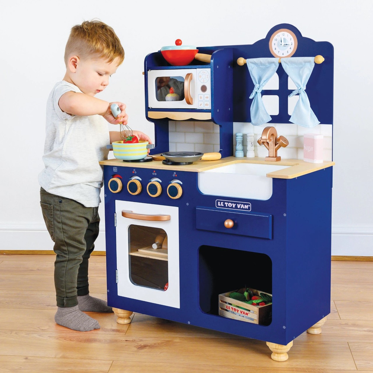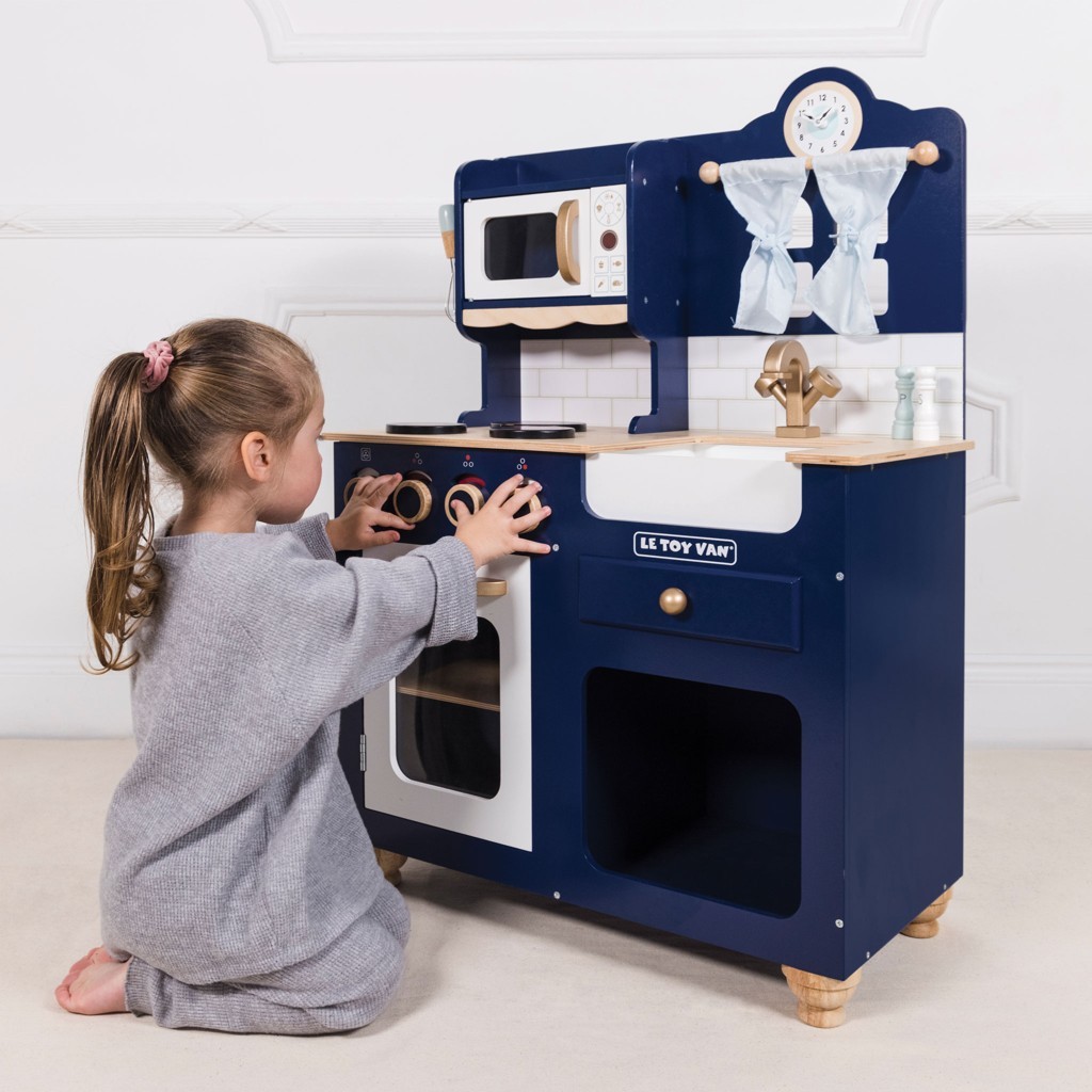 Kuchyňka Oxford je vyrobena z pevného a udržitelného dřeva, originální design z ní dělá unikátní kousek. Je malována v odstínu královské modři, její detaily jsou v barvě mědi. Tato tradiční hračka se bude hodit do každého dětského pokoje, děti nadchne k představivé hře na role. Mezi její funkce patří otevíratelné dveře trouby, otočné knoflíky, dřez, mikrovlnka, roztomilé okno se závěsy a hodiny s otočnými ručičkami. V balení najdete také metličku, vařečku, solničku a pepřenku. Vše pro malé šéfkuchaře a šéfkuchařky. Kuchyňku můžete dovybavit jídlem a doplňky z kolekce Honeybake od Le Toy Van. Krásná hračka, kterou si můžete předávat z generace na generaci. Hračky s účelemVšechny hračky firmy Le Toy Van jsou vyrobeny s cílem – aby dlouho vydržely. Designovány s láskou zkušenými řemeslníky za použití etických praktik a udržitelných materiálů, které jsou laskavější k naší planetě. Hlavní vlastnosti: dřevěná kuchyňka s doplňkyvyrobeno eticky z udržitelného dřevatestováno dle nejpřísnějších standardůmalováno netoxickými barvami na bázi vodyinspiruje ke kreativní a představivé hřepomáhá s rozvojem řeči a sociálních dovednostípodporuje při raném vývoji  Honeybake kolekce: Hračky v této kolekci jsou vhodné k objevování, pomohou dětem s rozvojem představivosti, sociálních a verbálních dovedností a kognitivních funkcí. Tradiční design s moderními detaily děti jistě bude bavit. Honeybake je kolekce Le Toy Van, která vyhrála nejvíce ocenění, a to za design, kvalitu, bezpečnost a také za vzdělávací a herní hodnotu.