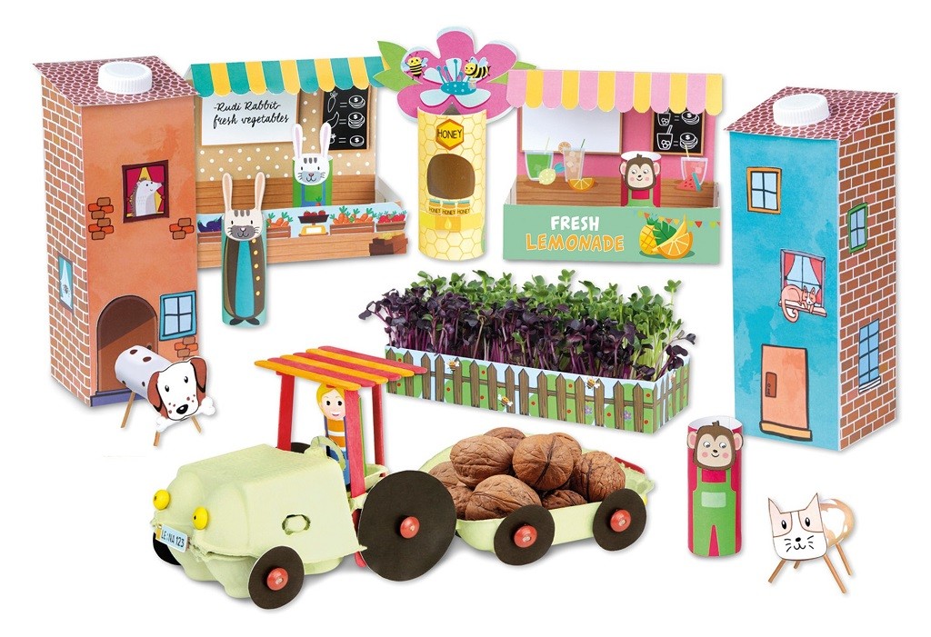Recykluj místo vyhazování. To je myšlenka zprostředkovaná souborem okouzlujících grafik, které promění starý obalový materiál v malou vesnici se stánky na trhu, bylinkovou zahrádkou, domy a traktorem. S knížkou příběhů a podrobným barevným návodem si všechno hravě zvládnete vyrobit. Baleno v barevném úložném boxu. Některé materiály k tvorbě projetu jsou obsaženy v krabičce, jiné si musíte zaopatřit z domácnosti. Vše je zobrazeno na obalu. Další informace naleznete v brožurce instrukcí. Kniha příběhů je v německém jazyce. Hlavní vlastnosti: podporuje kreativitu a představivostrozvíjí dětskou fantazii i zručnost jednoduché použitípraktické balení