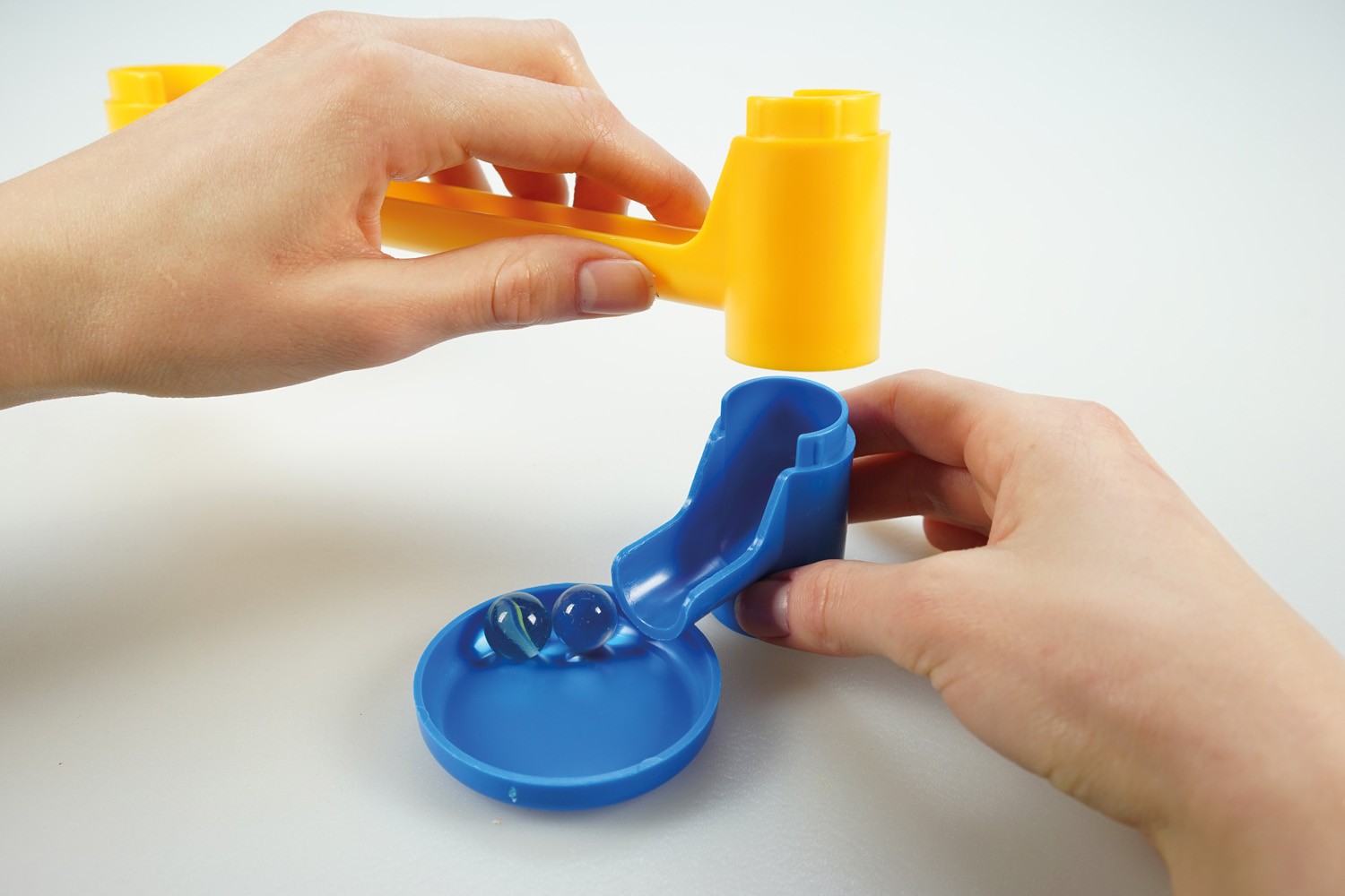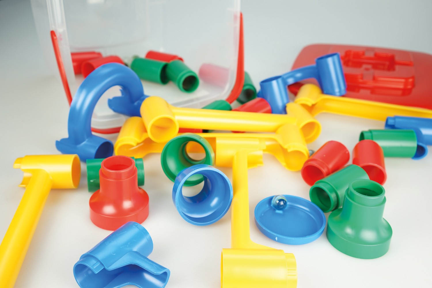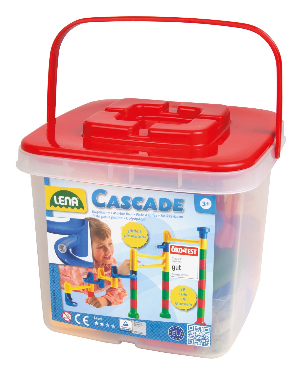 Barevná, plastová kuličková dráha v kyblíku. Obsahuje 29 dílů, 10 kuliček. Hlavní vlastnosti: různé variace drahlehce přenositelná