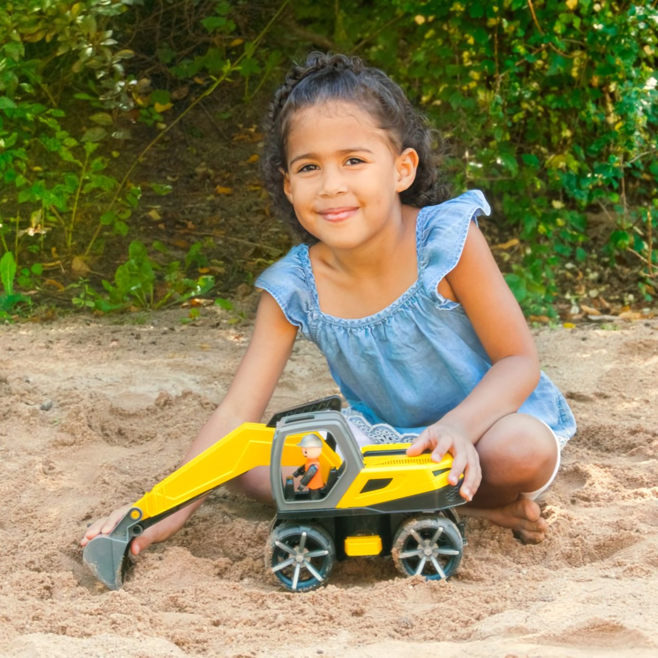 Propracovaný bagr ze série TRUXX 2 je velmi pevný a odolný, vhodný i ke hraní venku, na pískovišti. Je vybaven figurkou usměvavého řidiče a prostor jeho kabiny je snadno přístupný hrám. Otočné tělo bagru je opatřeno jednoduchou výsuvnou pojistkou, která jej zafixuje ve výchozí poloze. Plně funkční rameno se lžící lze jednoduše ovládat pomocí madla. Hračka je vyrobena z nezávadného plastu, dodávána v ozdobném kartonovém podstavci.   Hlavní vlastnosti:figurka řidiče, přístupná kabinaotočné tělo opatřené pojistkoufunkční, snadno ovladatelné rameno a lžícepevné a odolné provedenívyrobeno v České republice