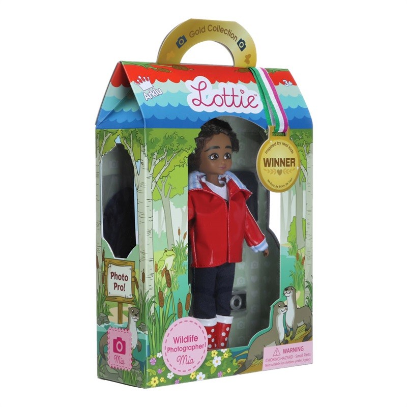 Od ptáčků a motýlů až po všechny druhy divoké zvěře je Mia milovníkem přírody. Kamkoli jde, nosí s sebou fotoaparát, protože kdo ví kdy nebo kde se objeví tak skvělá fotografická příležitost? Krásná fotka může vyprávět svůj příběh a může říct víc než tisíc slov. Mia doufá, že její obrázky inspirují další děti k tomu, aby milovaly divokou přírodu a stejně jako ona se o tuto naši nádhernou planetu dobře staraly! Nosí kochleární implantát, který je spíše součástí jejího příběhu než ústředním bodem. Je výsledkem spolupráce s britskou neziskovou organizací 'Toy Like Me', která vede kampaň za rozmanitost v dětských hračkách a za lepší reprezentaci postižení, aby se různě postižené děti mohly vidět ve svých hračkách, se kterými si den co den hrají. Jako ostatní panenky z oceňované kolekce Lottie je i tato realistická a snaží se děti naučit upřímnému pohledu na svět. Lottie jsou navrženy a zvláště uzpůsobeny malým dětským ručkám, mají pohyblivá kolena a jsou vyrobeny z prémiového měkkého vinylu a nylonu, bez použití ftalátů. Každá panenka je dodávána v atraktivní barevné kartónové taštičce s plastovým průhledem a uchem. Hlavní vlastnosti: kloubová panenka s pohyblivými koleny, perfektní pro představivou hruprémiové nylonové vlasy jsou hebké na dotek a nezamotávají sepanenka z vinylu bez obsahu ftalátů, měkká na dotekpanenka má snímatelné boty a stojí samostatněhnědé vlasy, hnědé očimilované všemi dětmi, vhodné od 3 letspeciální panenka ve zlaté edici Balení obsahuje: Mia, mladá fotografka divoké zvěře, vybavená červenou bundou, tričkem s beruškou, modrou čepicí, taškou, džínami, červenými flekatými holínkami a kochleárním implantátemfotoaparát
