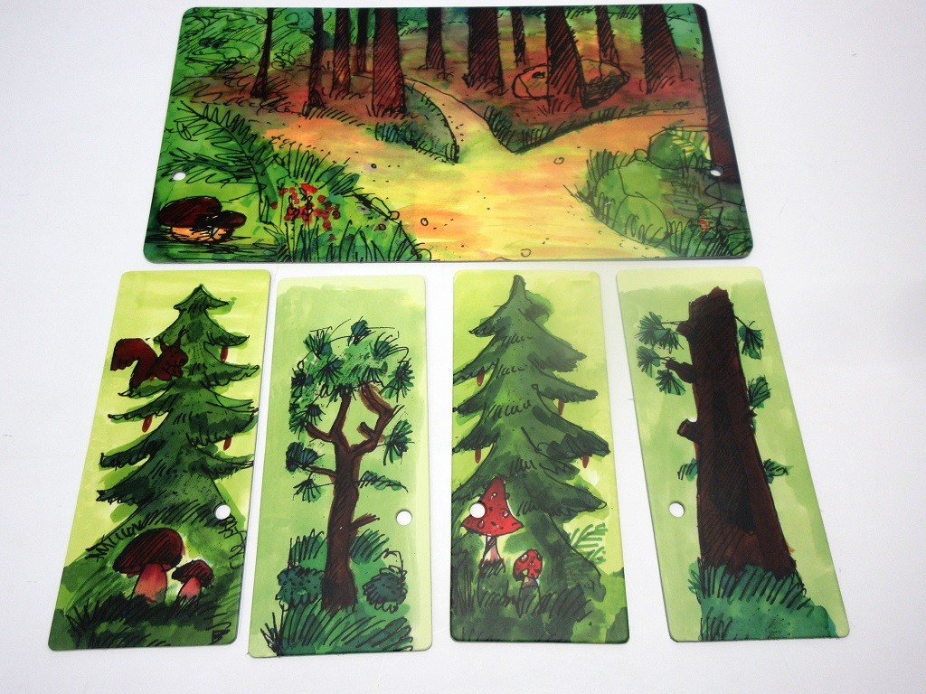 Oboustranná scéna pro Gerlichovo loutkové divadlo představující tajuplné lesní rozcestí a vodníkův podvodní příbytek plný hrníčků. Hlavní vlastnosti: Rozměry hlavní scény jsou 40x23 cm, boční panely 4ks 9,5x23cm Oboustranná scéna pro gerlichova divadla