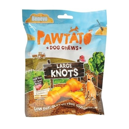 Odmeny pre psy, Pawtato Knots sú vyrobené z 87% sladkých zemiakov, prírodných super-potravín, plných živín. Tieto žuvcie maškrty v tvare uylíkov sú skvelou hypoalergickou alternatívou k podobným výrobkom zo surovej kože. Benewo Knots veľkosť L sú približne 10cm dlhé.