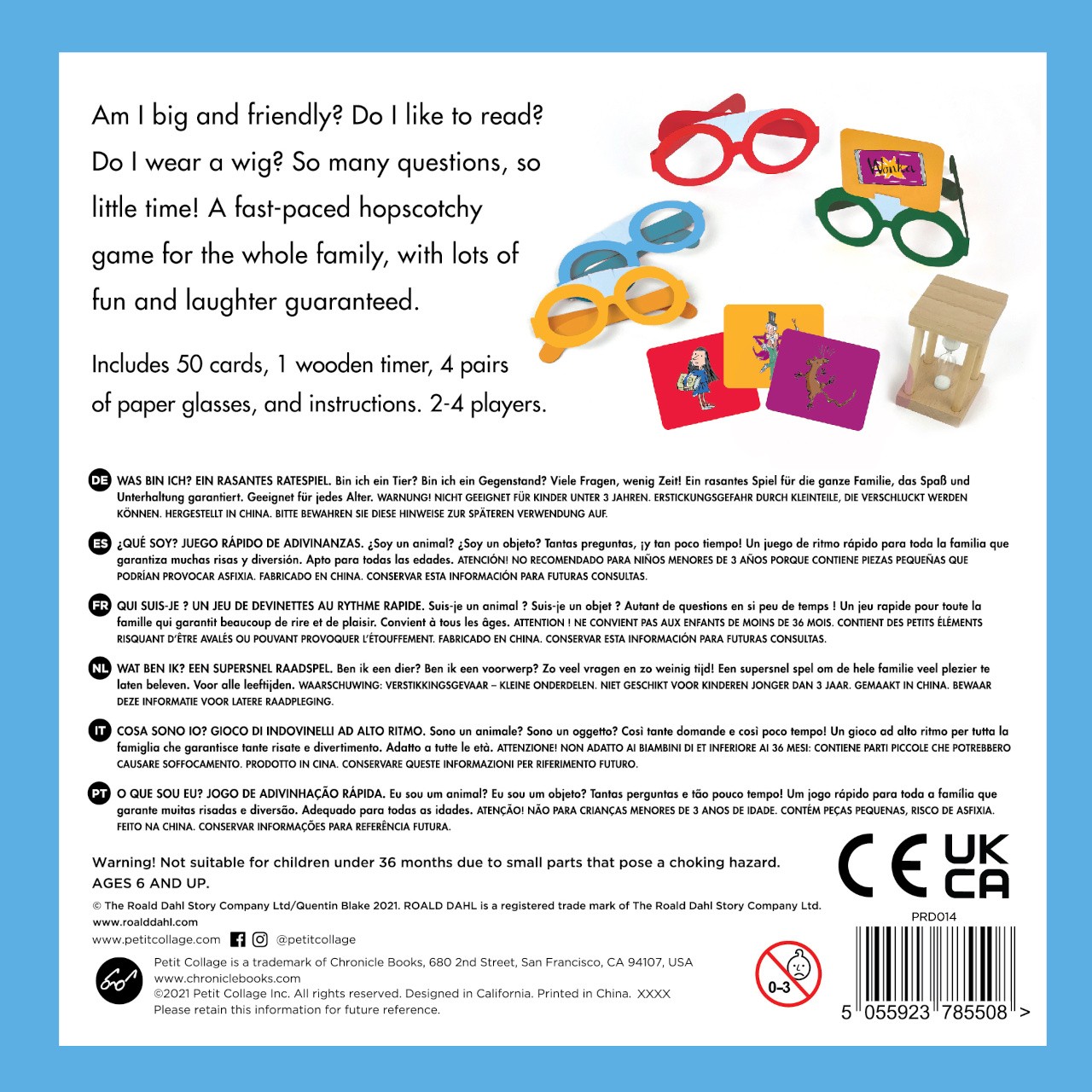 Vylosujte si kartičku, vložte ji do legračních brýlí, aby ji viděli jen ostatní, a otočte přesýpací hodiny. Sérií svých otázek a odpovědí spoluhráčů se pak ve vyměřeném čase pokuste rozklíčovat, jakou postavu, nebo předmět ze světoznámých příběhů Roalda Dahla jste si vylosovali. Času máte málo, otázky musíte rychle, ale pečlivě vážit! Karty zdobí původní, originální ilustrace z knih. Obsažené brýle jsou ve dvou velikostech, pro děti i dospělé, hra je tak zvláště vhodná pro chvíle trávené v rodinném kruhu. Součásti jsou vyrobeny z udržitelně získaného papíru, potištěny rostlinnými inkousty a baleny v praktické, barevně ilustrované krabičce.   Hlavní vlastnosti:pro 2–4 hráče4 papírové brýle, 50 ilustrovaných karet a přesýpací hodinyilustrace sira Quentina Blakeavyrobeno ze 100% FSC® certifikovaného papírupotištěno rostlinnými inkousty     Značka a certifikát FSC® (Forest Stewardship Council) zaručuje, že dřevo, ze kterého byl produkt vyroben, nebylo vytěženo nelegálně a pochází z lesů obhospodařovaných šetrným či přírodě blízkým způsobem, ve kterém jsou dodržovány přísné environmentální a sociální požadavky. Značka FSC® na výrobku znamená, že svým nákupem pomáháte chránit lesy a podporujete šetrné, odpovědné či přírodě blízké hospodaření, díky kterému jsou naše lesy stabilnější, zdravější, mají přirozenou druhovou skladbu a lépe odolávají negativním následkům klimatických změn.