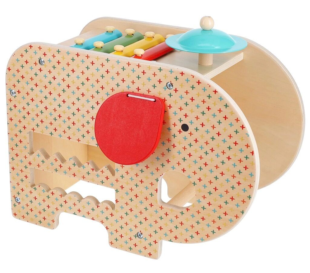Seznamte své ratolesti s rytmem a zvukem! Všestranný dřevěný slon obsahuje pět různých možností hry. Můžete jeho uši nechat klapat, hrát na xylofon, bouchat do bubínku, klepat na činel či paličkou využít trojitého guira - poslouchejte jedinečné zvuky a bavte se! Tato dřevěná hudební hračka pomůže rozvíjet jemné motorické dovednosti Vašeho děťátka jako např. koordinaci ruka-oko, sluchové učení a rozlišování zvuků. Volný způsob hry navíc podporuje sebevyjádření, rozhodování a nezávislost. Hlavní vlastnosti: rozvíjí jemnou motoriku a kreativituhravý úvod do světa zvuku a rytmuklapky xylofonu vydávají odlišné tónyvyrobeno ze 100% FSC® dřevaoriginální a funkční design   Značka a certifikát FSC® (Forest Stewardship Council) zaručuje, že dřevo, ze kterého byl produkt vyroben, nebylo vytěženo nelegálně a pochází z lesů obhospodařovaných šetrným či přírodě blízkým způsobem, ve kterém jsou dodržovány přísné environmentální a sociální požadavky. Značka FSC® na výrobku znamená, že svým nákupem pomáháte chránit lesy a podporujete šetrné, odpovědné či přírodě blízké hospodaření, díky kterému jsou naše lesy stabilnější, zdravější, mají přirozenou druhovou skladbu a lépe odolávají negativním následkům klimatických změn.