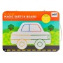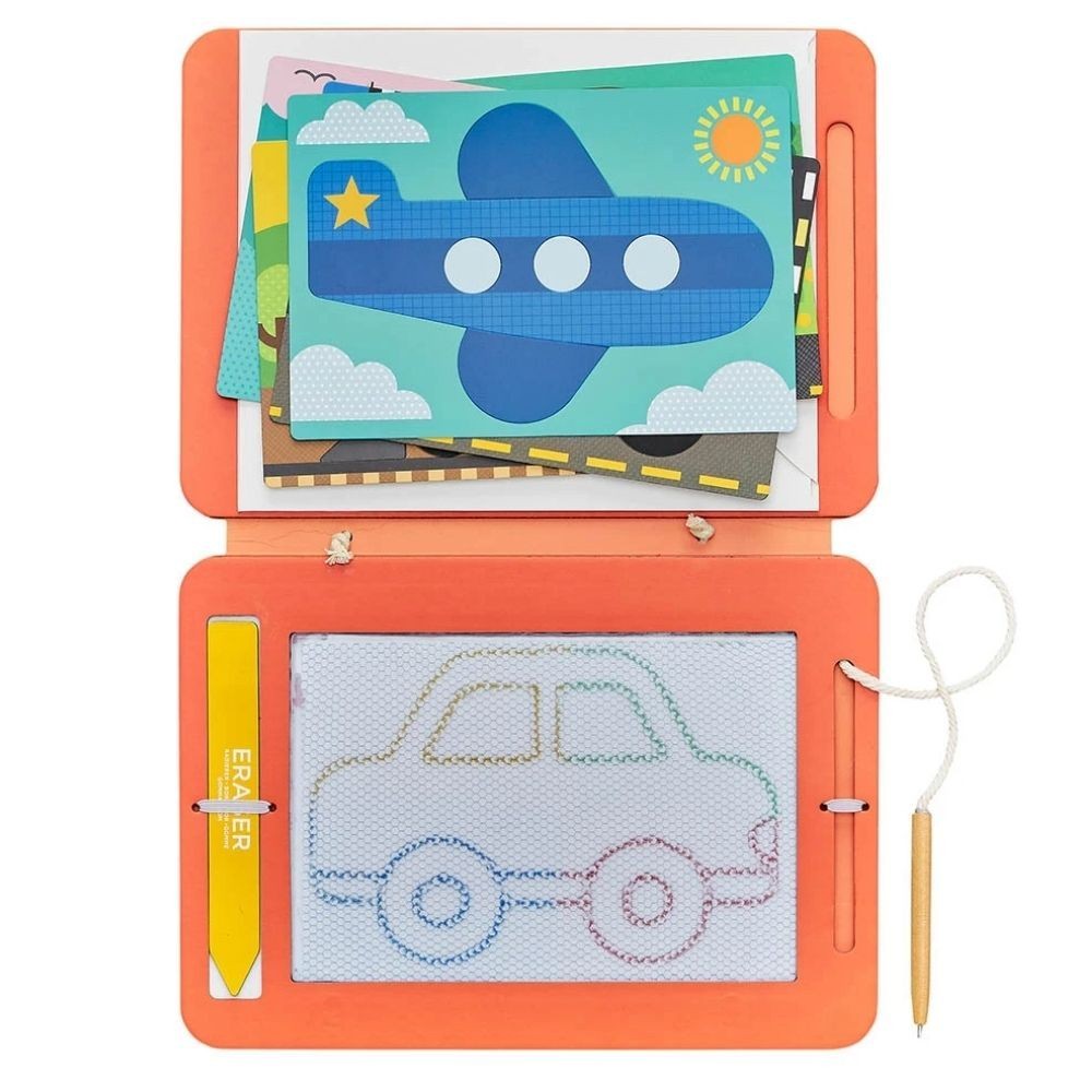 Rozprouděte představivost dětí s touto magnetickou kreslící tabulkou! Perfektní kreativní hračka domů i na cesty, má magickou tužku, která je připevněna k tabulce provázkem. Dále zde najdete mízítko a 5 ks předlohy pro kreslení. Když zrovna nekreslíte, můžete předlohy uložit do kapsy tabulky. Přiložte mizítko z druhé strany tabulky a rychle vymažte své umělecké dílo – můžete začít kreslit něco nového. Vyrobeno za použití recyklovaných materiálů, natištěno barvami na bázi zeleniny. Vhodné od 4 let. Neobsahuje BPA, ftaláty, olovo ani formaldehyd. Tolerance několika nemazatelných bodů. Hlavní vlastnosti Kreativní hračka, která trénuje kreativituTužka a mizítko5 ks předlohyObal vyroben z recyklovaných eko materiálůZdravotně nezávadnéVhodné od 4 let