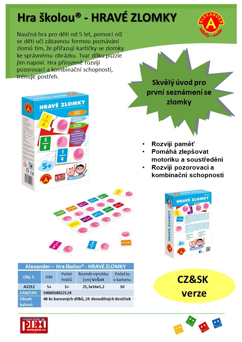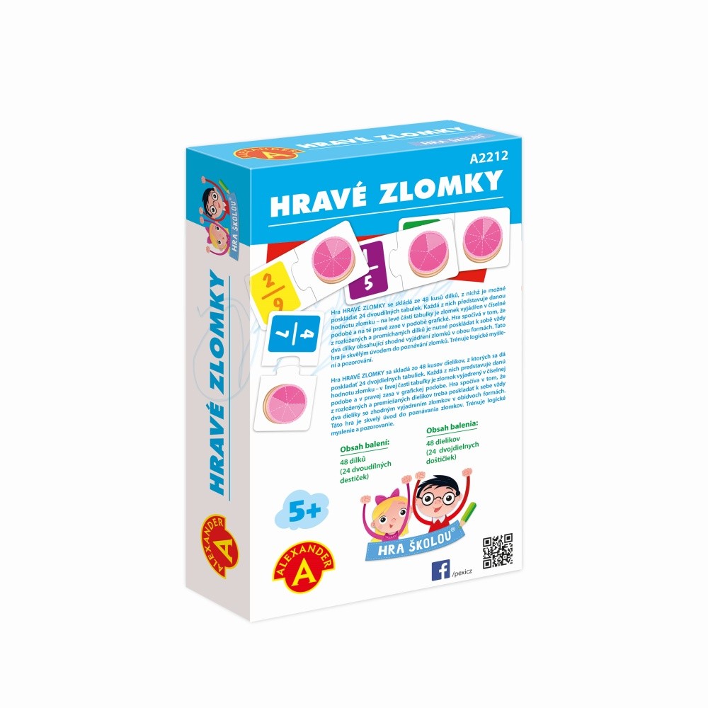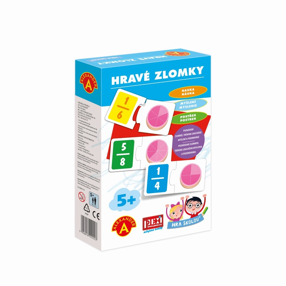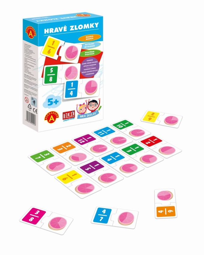 Naučná hra pro děti od 5 let do 10 let, pomocí níž se děti učí zábavnou formou poznávání zlomků tím, že přiřazují jednu polovinu kartičky se zlomkem k druhé půlce s obrázkem. Tvar dílku puzzle jim napoví správnou odpověď. Hra zábavnou formou a přirozeně pomáhá pochopit "rozdělování" tedy zlomky a dělení za využití obrázkového znázornění. Využívá soutěživost pro rychlé zvládnutí problematiky. Díky obrázkům lze rychle pochopit souvislost mezi zlomky a množstvím, které vyjadřují. Puzlíky jsou skvělým a hlavně nenásilným úvodem do poznávání zlomků. Hlavní vlastnosti: Pomáhá chápat souvislost mezi zlomky a množstvím, které vyjadřují Pomáhá zlepšovat logické uvažováníZjednodušuje vysvětlování dané problematiky Rozvíjí pozorovací a kombinační schopnosti Obsah balení: 48 pevných dvoudílných kartonových destiček s obrázky a čísly, český a slovenský návod ke hře