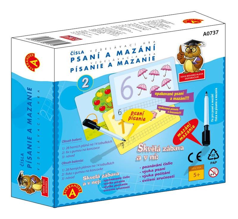 Vzdělávací hra s jednoduchými početními kvízy, která děti kreslením po předloze naučí správné tvary čísel, jejich poznávání a správné držení pera. Hra trénuje počítání, manuální zručnost, postřeh. Texty lze opakovaně mazat. Kreslením po předloze se dítě rychle naučí správné tvary čísel a současně zdokonaluje svou manuální zručnost. Zadní strany kartiček obsahují jednoduché zábavné kvízy pro procvičení práce s čísly.Hra se skládá z 28 naučných motivů a zadání na 14 tabulkách a přiložené "mazací" fixy na psaní. Polovina motivů zobrazuje číslice 1-14. Každá číslice obsahuje pomocnou přerušovanou čáru, která pomáhá při kreslení jeho tvaru. Obrázky u čísel jsou výbornou pomůckou pro výuku počítání, protože jejich počet znázorňuje dané číslo.Každý obrázek lze z tabulky setřít houbičkou, která je umístěna na násadce fixu. Děti mohou opravovat chyby a používat tabulky opakovaně. „Psaní a mazání – Čísla“ je výborná zábava a výuka současně. Hračka je také dobrým tréninkem postřehu, soustředění, logického myšlení a asociací. Balení obsahuje: 28 početních motivů a zadání na 14 tabulkáchstírací fix s houbičkou na koncovcečeský a slovenský návod Hlavní vlastnosti: vzdělávací hra určená dětem, které se učí číst a počítattrénuje počítání, manuální zručnost, postřeh Dokumentace: návod ke hře CZ,SK
