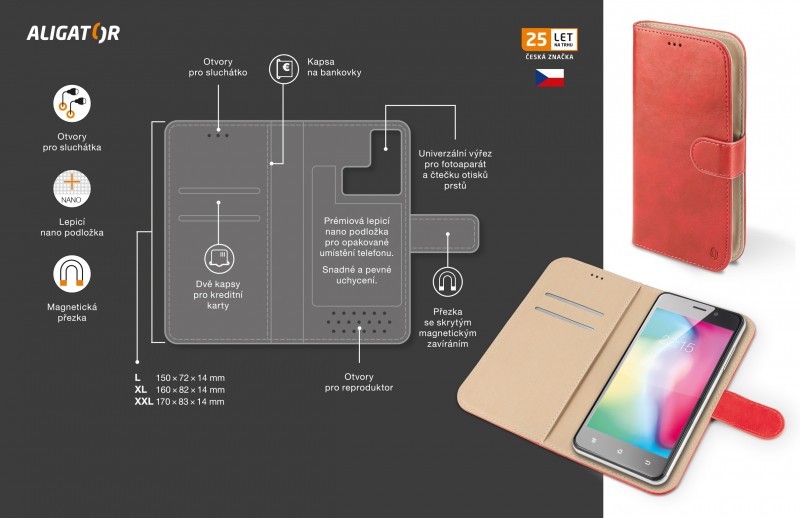 Rozměry samotného pouzdra jsou přizpůsobeny telefonům s novým poměrem stran displeje 18:9, ale zároveň jsou stále kompatibilní i s klasickými mobilními telefony.