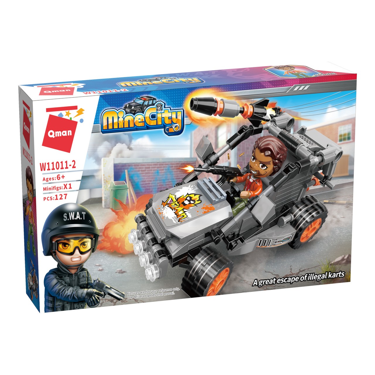 Šlápněte na plyn a unikněte policii ozbrojenou motokárou! Vysoce variabilní stavebnice Qman z pestrobarevných plastových kostiček lze kombinovat s podobnými stavebnicemi mnoha dalších významných výrobců. Vyrobeno z kvalitního, nezávadného a odolného, ABS plastu. Baleno v pestře potištěné papírové krabičce. Hlavní vlastnosti:127 dílků a 1 figurkakompatibilní se stavebnicemi dalších výrobců