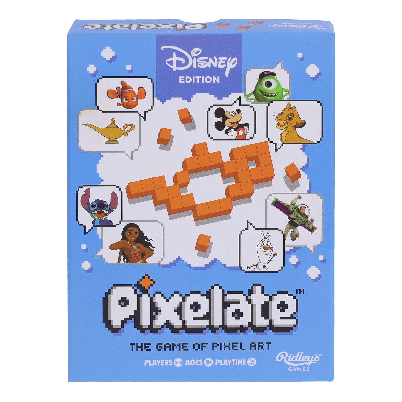 Povolte uzdu své představivosti s hrou Disney Pixelate – pixeluj. Vytáhněte si kartu předlohy, zkuste dle ní co nejlépe z malých barevných kostiček, pixelů, poskládat vaše oblíbené postavičky od Disney a Pixaru. Ostatní hráči hádají, co jste to vlastně složili. Máte pouze 90 vteřin a čím dále se ve hře dostanete, tím méně kostiček budete mít k dispozici. Dokážete poskládat Aladinovu lampu pouze ze 4 pixelů?Po třech odehraných kolech vítězí hráč s největším počtem kostiček pixelů na bodovací kartičce.Perfektní hra pro fanoušky Disney, Pixaru a celou rodinu.V balení návod v angličtině, časomíra, 150 obrázkových karet, 5 bodovacích karet, 100 dřevěných pixelů a 1 výtvarná podložka, na které budete obrázky skládat. Hlavní vlastnosti: představivá hra pro 2-8 hráčůprůměrná doba hry 30 minuttrénuje motoriku, rozvíjí kreativitu dětídřevo, papír