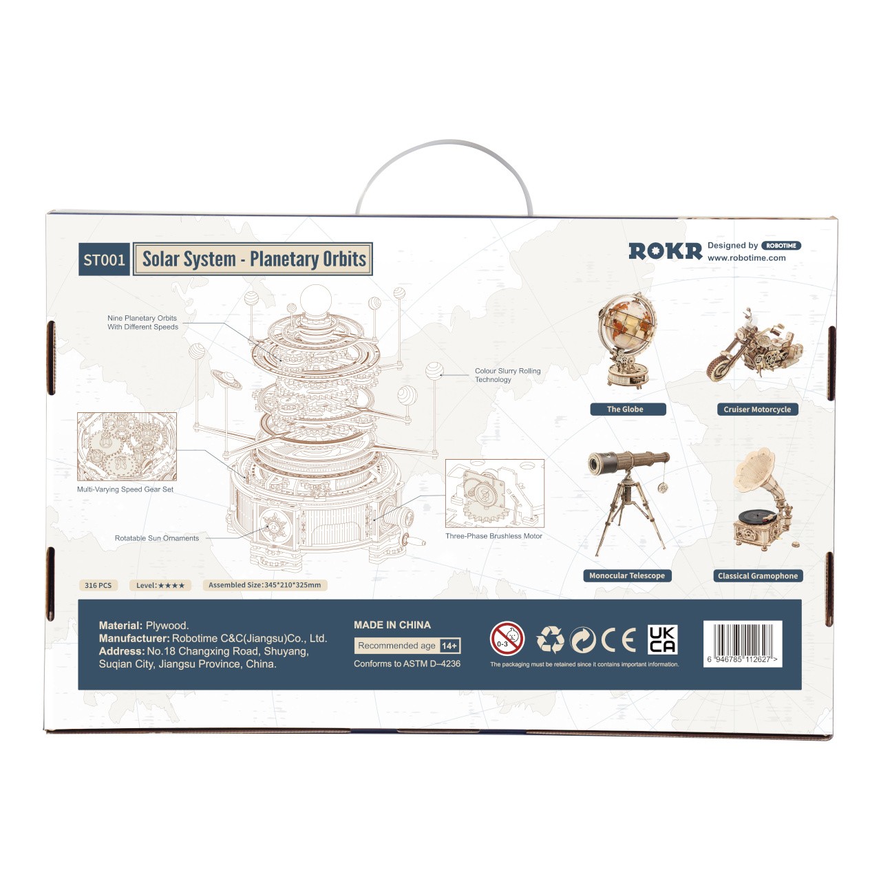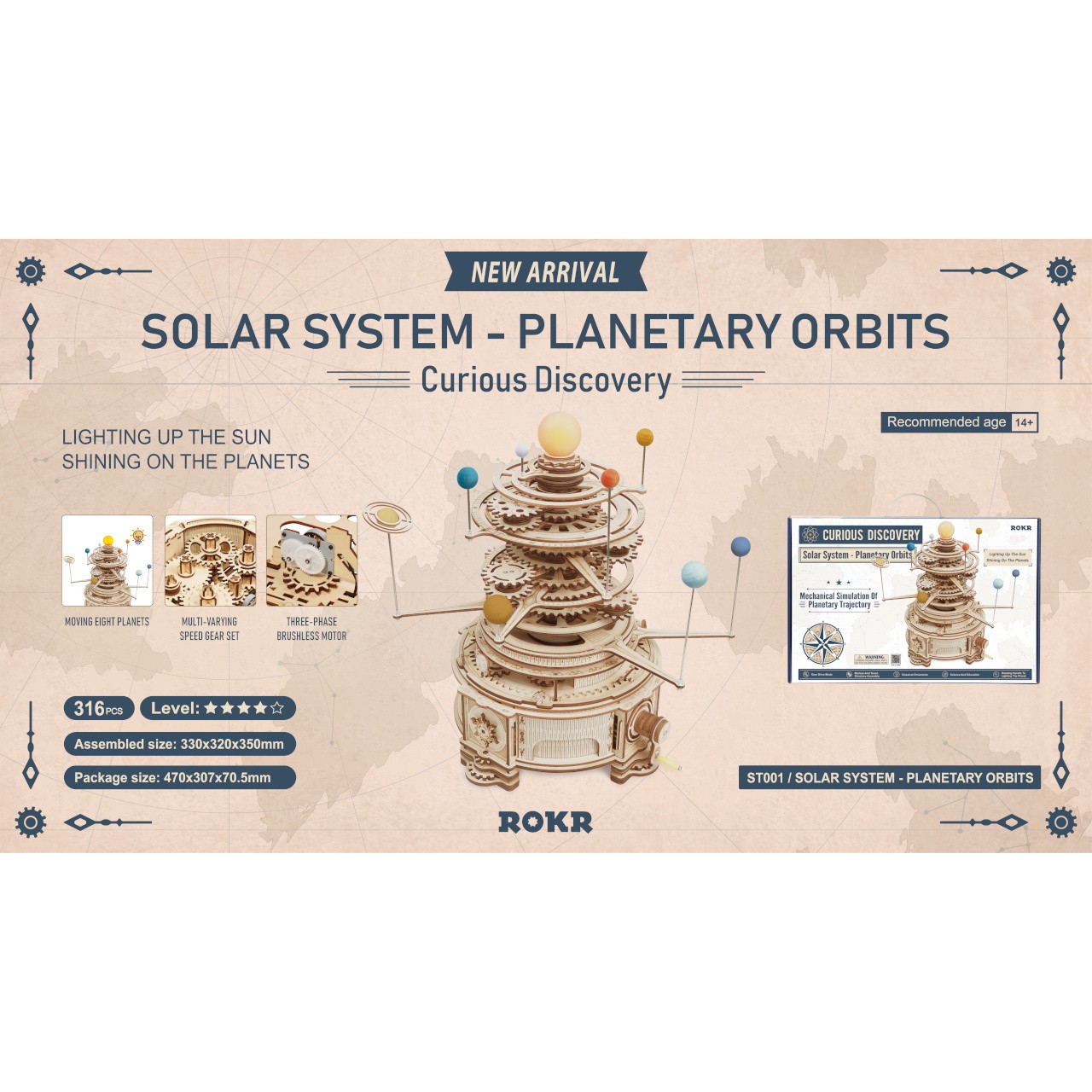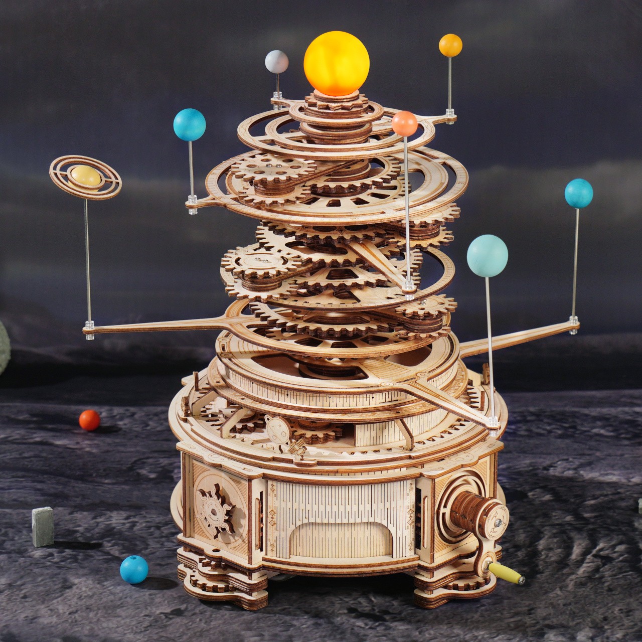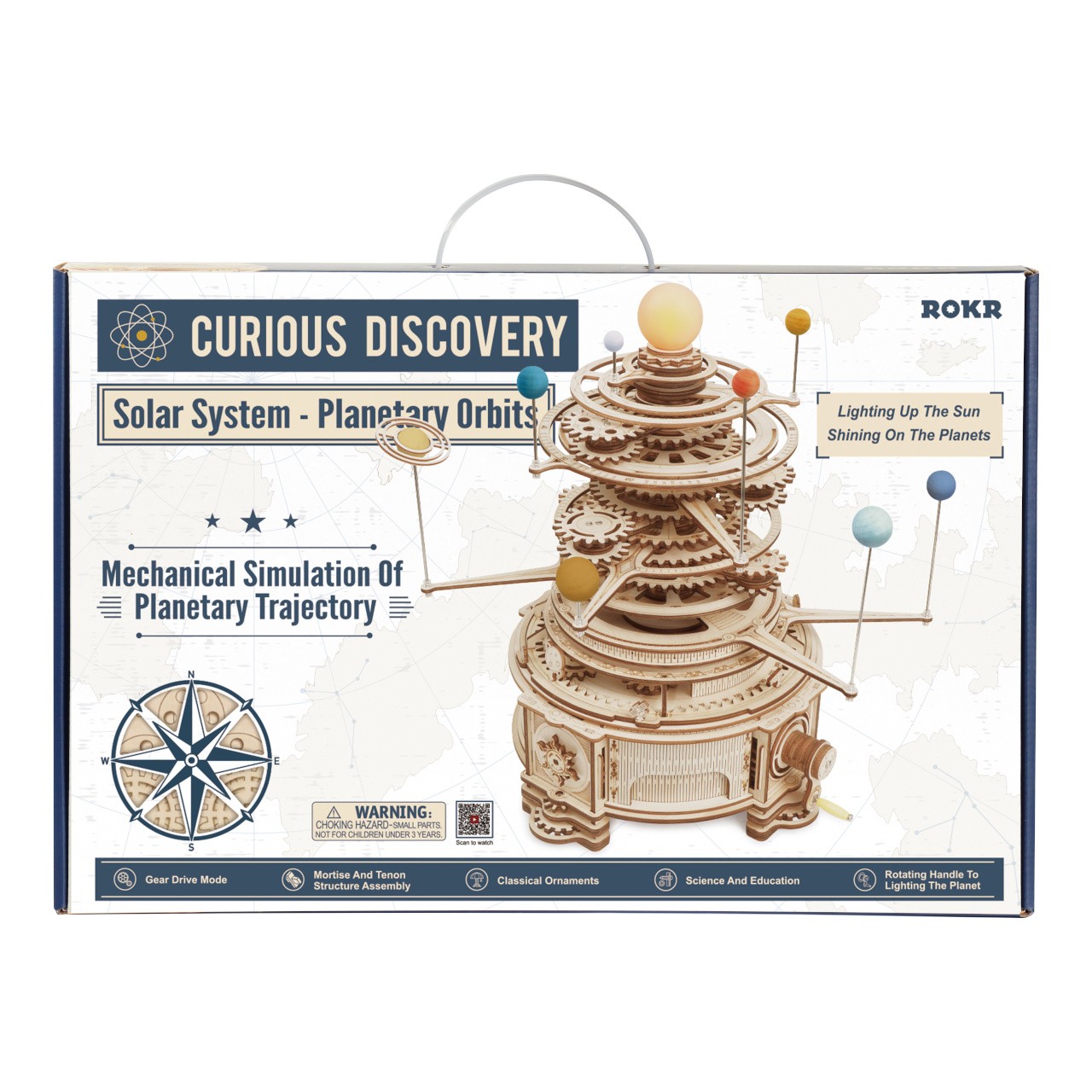 Prozkoumejte Sluneční soustavu se stavebnicí planetária z překližky. Jeho stavba představuje výzvu, která podněcuje zvědavost a můžete při ní rozvíjet své dovednosti. Po sestavení je možno obdivovat osm planet obíhajících různou rychlostí Slunce ve středu modelu. Mechanismus je navíc opatřen dynamem, díky kterému Slunce při otáčení klikou skutečně svítí, a vnáší tím do pohybu neopakovatelnou atmosféru. Planety jsou vyvedeny v pestrých barvách, vyrobeny z odolné buničiny. Pohání je soustava převodů navržená s důrazem na vždy dokonale hladký a plynulý chod. Hotový model vybízí k využití jako názorná učební pomůcka pro děti, ale dovedně také zkrášlí poličku, nebo malý stolek, a zútulní tak pokoj každého fanouška astronomie. Skládačka je dodávána v nesloženém stavu, balena v krabici. Vybaveno detailním návodem k sestavení. Hlavní vlastnosti:316 precizně vyřezaných dílkůvysoká obtížnost sestavenídynamem poháněný světelný efekt