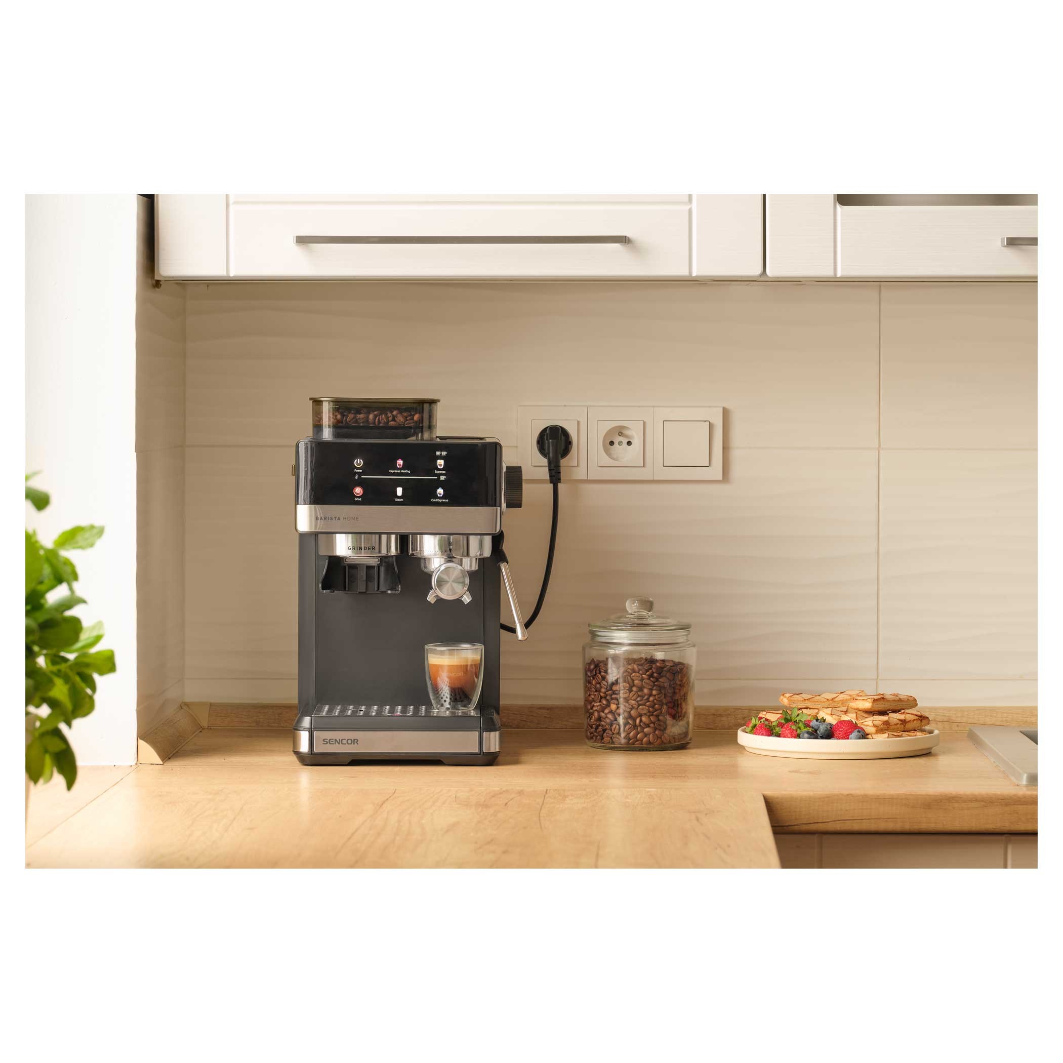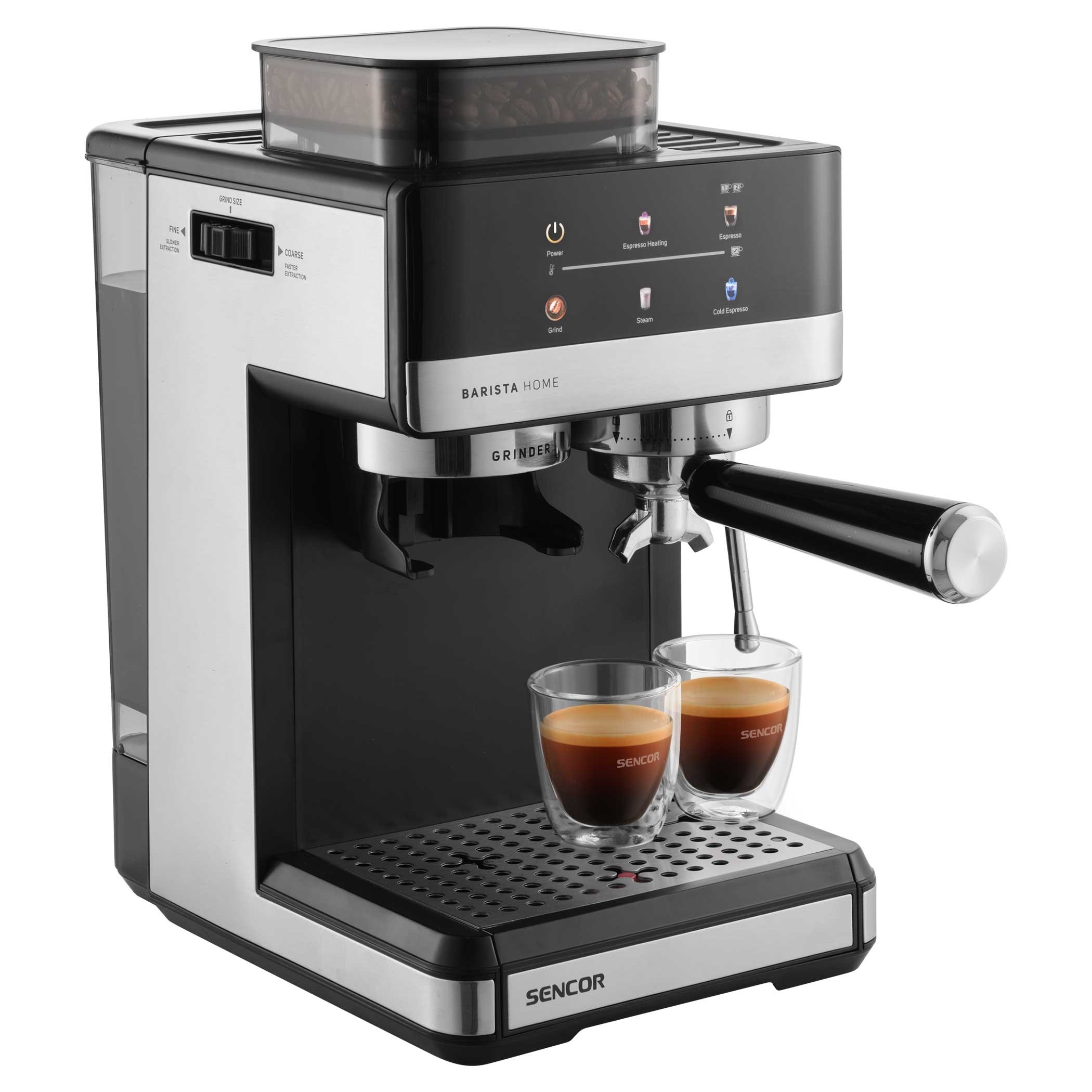 Sencor SES 5000SS je určený na domácu prípravu espressa, mliečnych aj studených kávových nápojov. Používateľ si môže zvoliť hrubosť mletia, pripraviť horúcu alebo ľadovú kávu a pomocou parnej trysky napeniť mlieko na cappuccino alebo latte macchiato. Vďaka systému Thermoblock je kávovar rýchlo pripravený na použitie a udržiava stabilnú teplotu vody.
