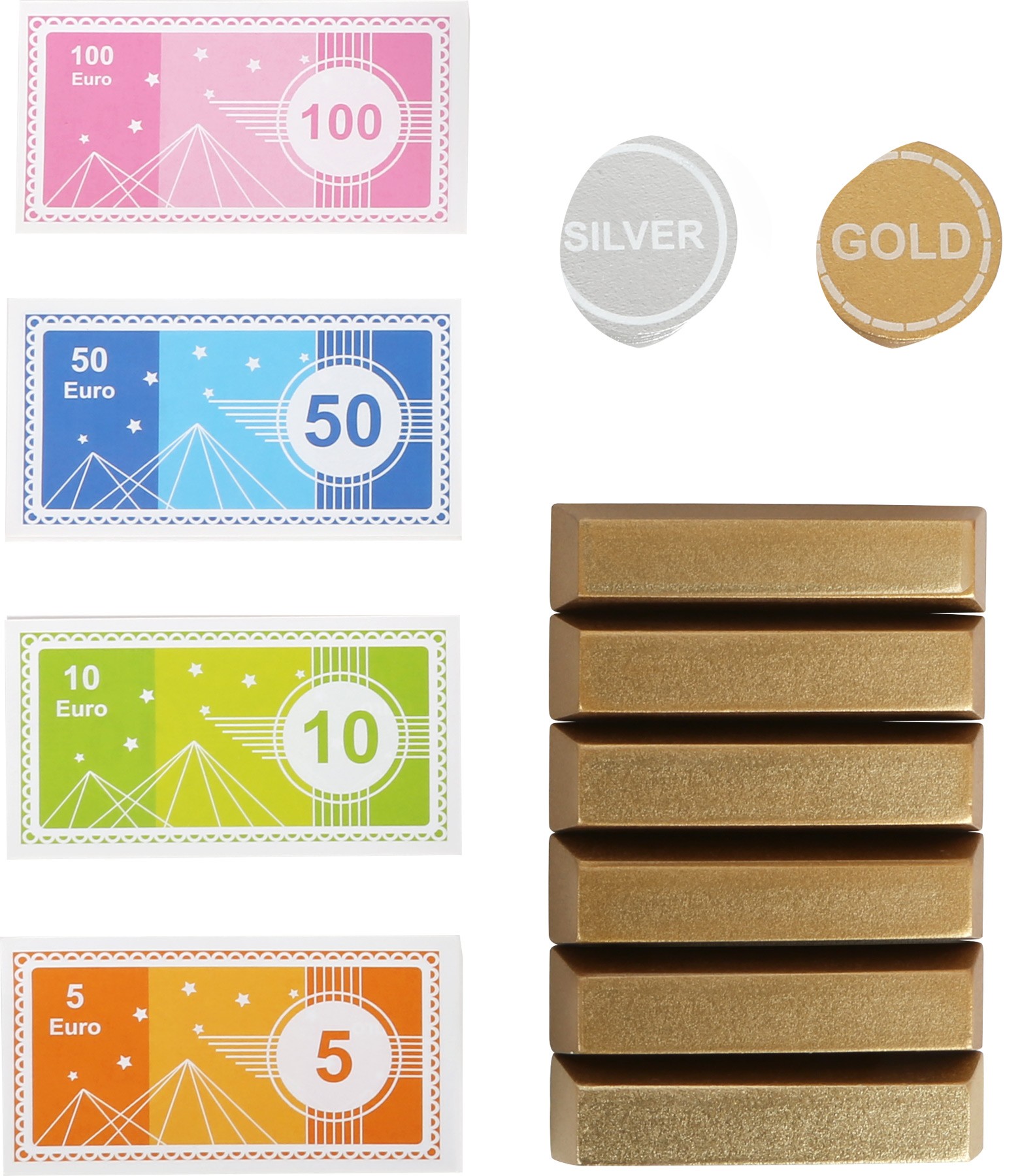 Bankéři a lupiči, pozor! Tento dřevěný sejf je opravdu něco! Při správné kombinaci se sejf otevře a odhalí svá tajemství – Euro bankovky, zlaté a stříbrné mince, ale i cihličky zlata (vyrobené ze dřeva). Otočný zámek vydává zvuk a tlačítka se dají mačkat.  Hlavní vlastnosti: obsahuje 68 ks příslušenstvíotáčivý cvakající ciferník a mačkací tlačítka pro zadání kóduvhodné pro hraní rolí či na úschovu vlastních drobných pokladů