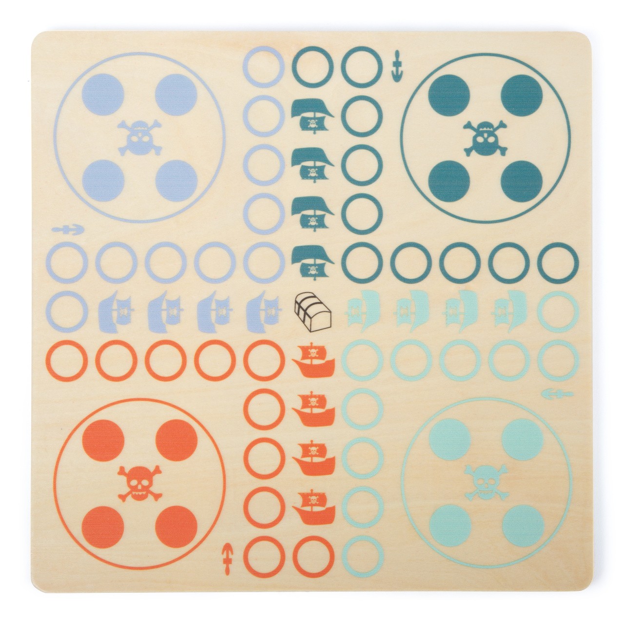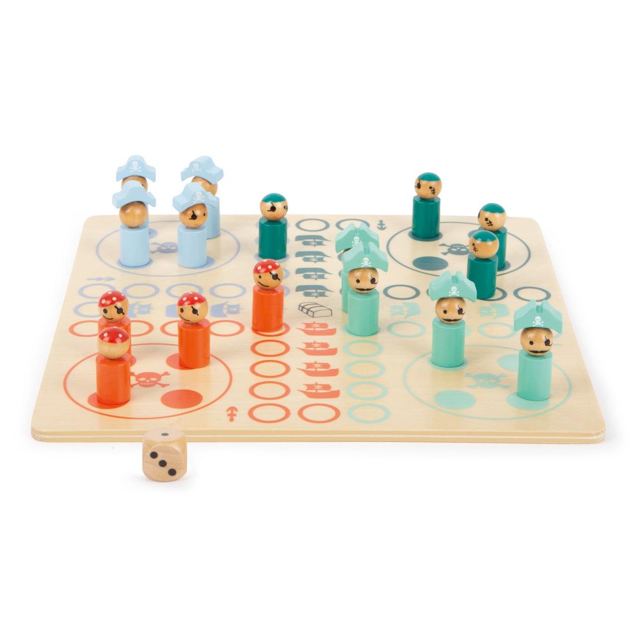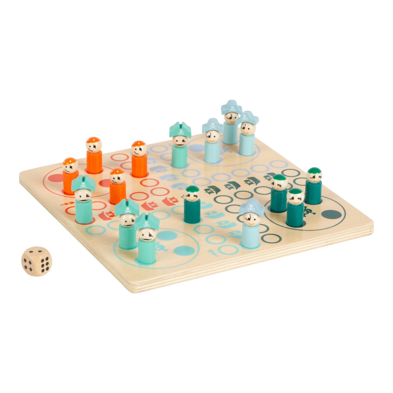 Bukanýři, pozor! Dřevěné Člověče s bukanýry na palubě. Cílem je dostat všechny piráty na svou loď. Kostka ukazuje o kolik polí se můžete posunout. Děti si procvičí počty zábavným způsobem. Herní figurky jsou velmi detailní, hra má kompaktní velikost. Hlavní vlastnosti: herní deska, 8 figurek pirátů a 8 bukanýrů, kostka