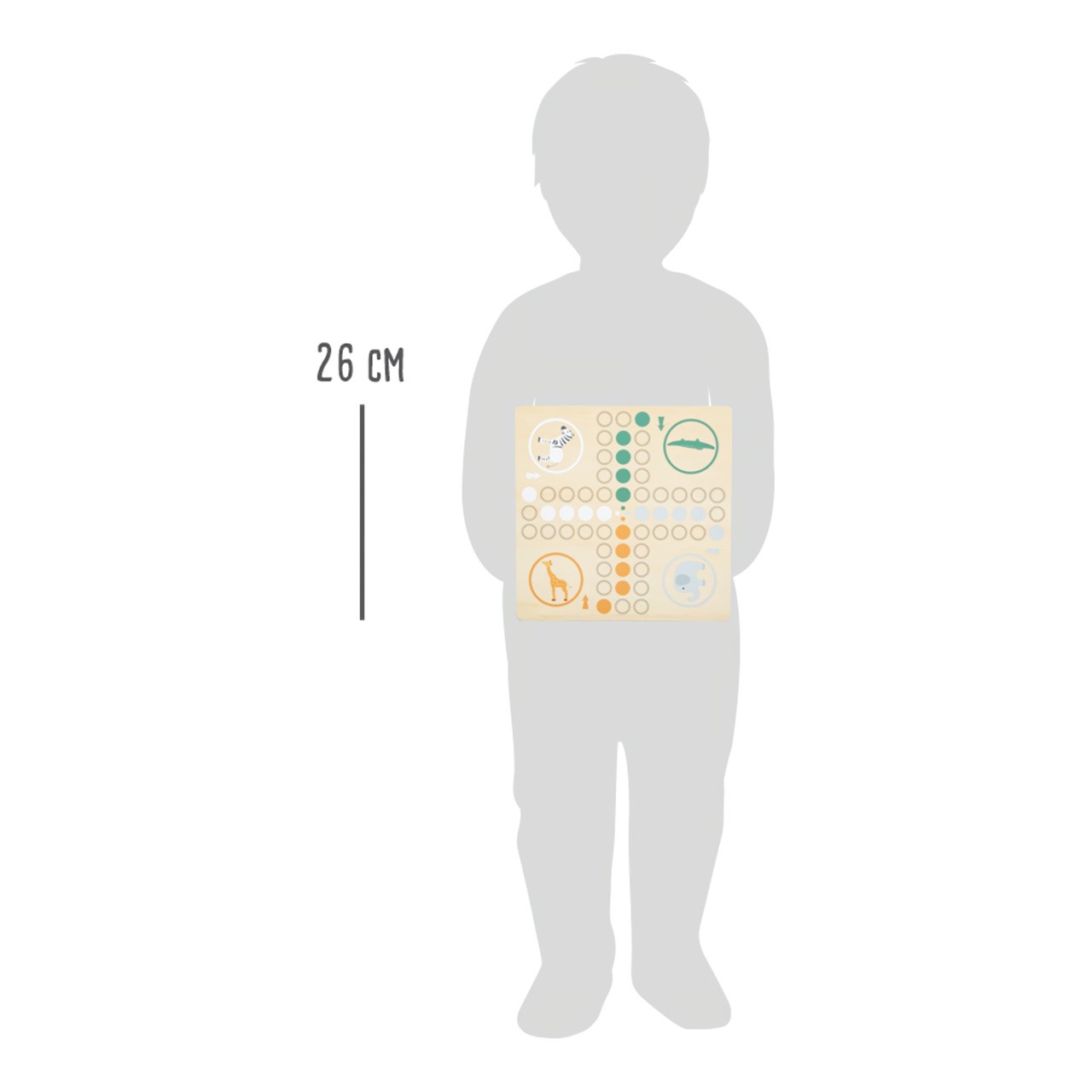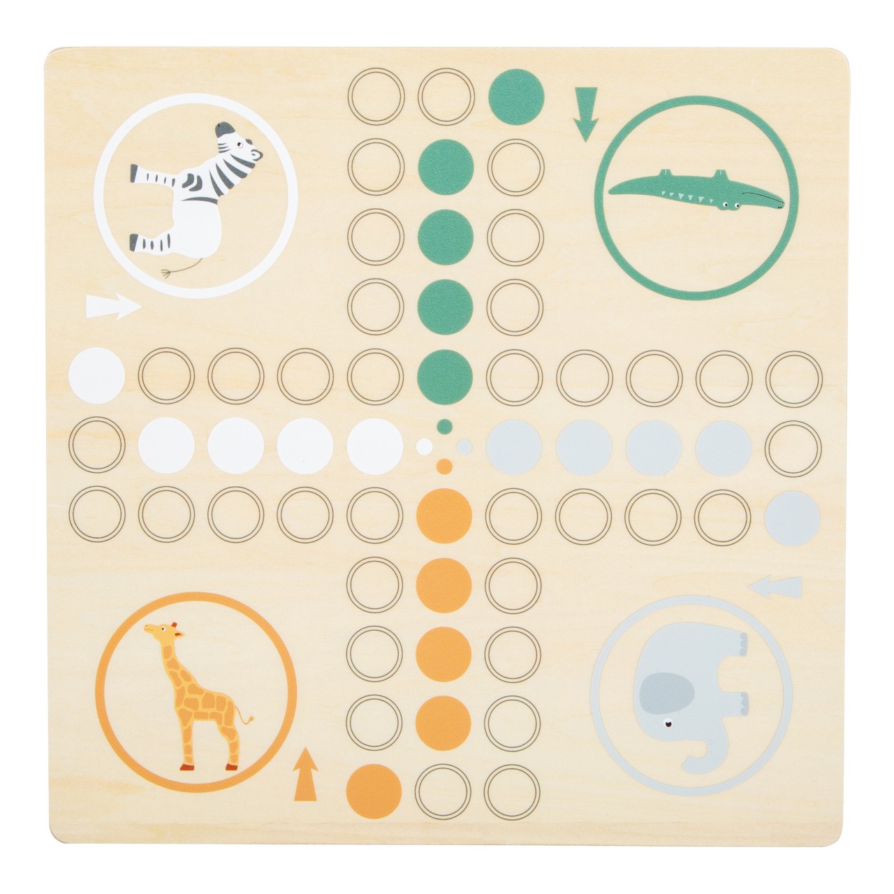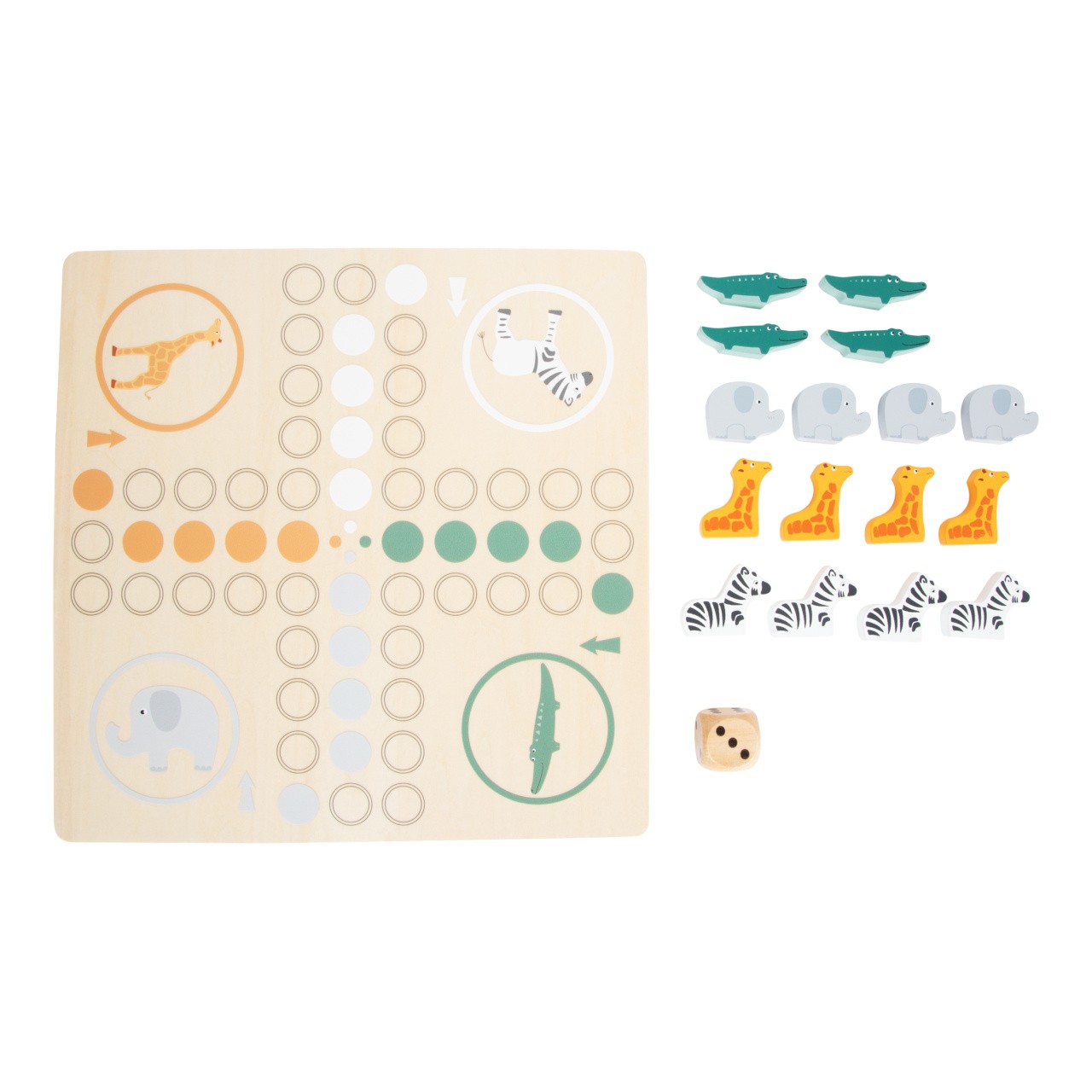 Safari přímo u vás doma. Toto dřevěné Člověče má figurky zebry, slona, žirafy a krokodýla. Cílem je dostat všechny figurky do domečku. Extra velká kostka vám ukáže, o kolik polí se můžete posunout. Klasická stolní hra v trendy designu, která děti naučí počítat, poznávat barvy a zvířata. Děti se také naučí prohrávat. Hlavní vlastnosti: vhodné pro 2-4 hráčeherní deska, 16 figurek zvířátek a kostkapestrobarevné provedení