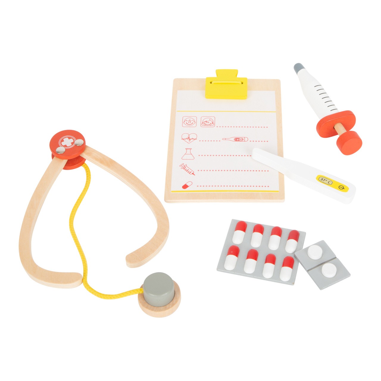 Zubní kazy nebudou mít šanci! Kufřík na zámek udělá dojem svými dřevěnými doplňky s pěkným designem. Dětská stříkačka, vrtačka, kartáček, sada zubů, zubní pasty a kleští, tato dřevěná dětská sada pro zubaře má vše! Dva šedé zuby děti naučí důležitosti zubní hygieny. S teploměrem, balzámem, pinzetou, tabletkami a poznámkovým blokem se kufřík hodí také ke hře na lékaře. Perfektní hračka, která děti připraví na první návštěvu u zubaře nebo lékaře. Děti si mohou zahrát na lékaře, tato hra podporuje kreativitu a dodá dětem odvahu. Všechny doplňky se pohodlně vejdou do kufříku. Otevřete si vlastní praxi! Hlavní vlastnosti Dřevěný kufřík na zámekTeploměr, balzám, injekční stříkačka, pinzeta, tablety, model zubůPěkný dětský design