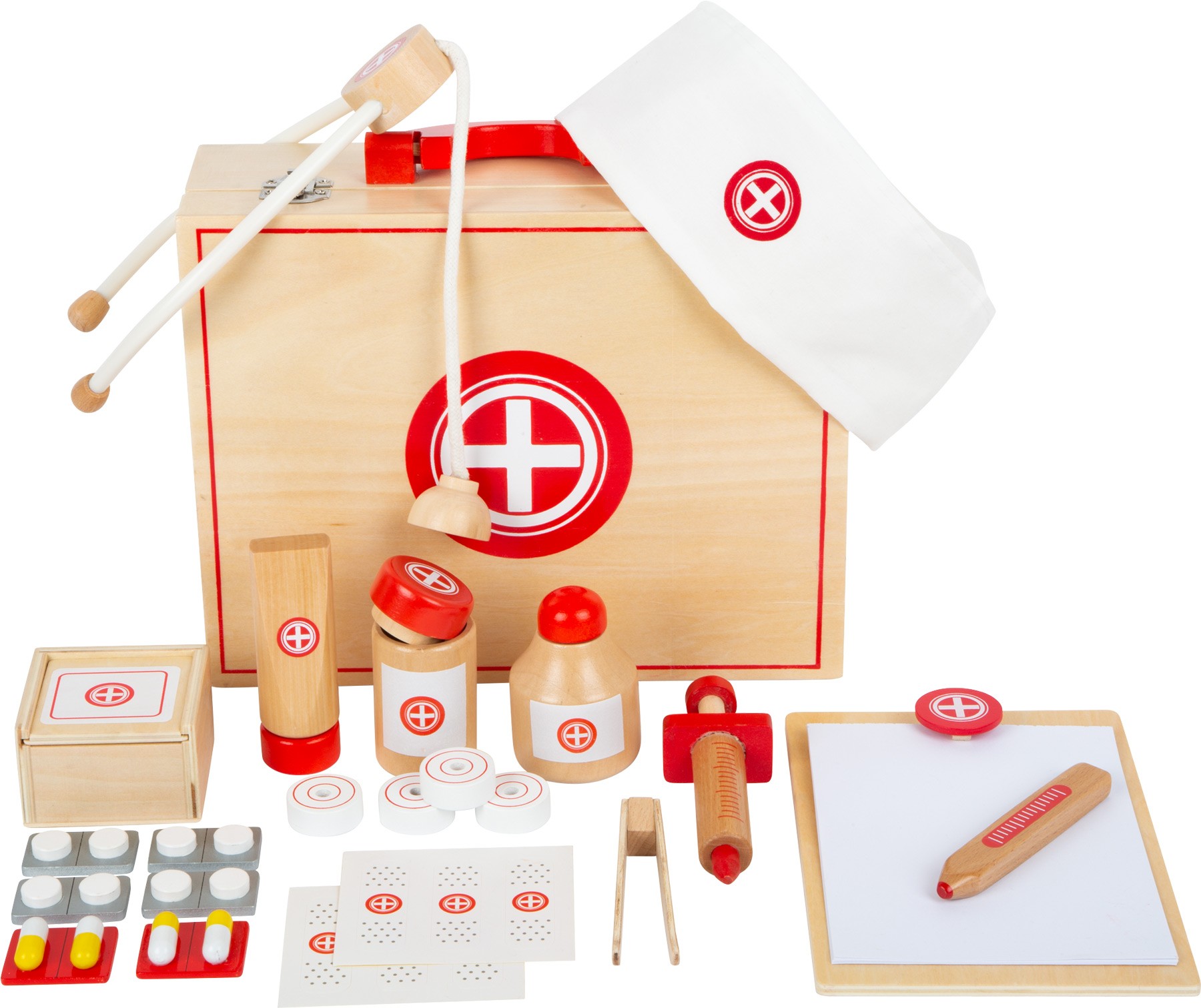 Lékaři už jsou na cestě! Mladí doktoři a doktorky se mohou s tímto dětským setem perfektně vybavit na cestu k pacientům. Kufřík obsahuje všechny důležité zdravotnické pomůcky, také vypadá pěkně – je plně dřevěný s klasickou bílo-červenou barvou. V kufříku najdete balení mastičky, láhev s tinkturou, stetoskop, injekční stříkačku, náplasti, tabletky, pinzetu, teploměr, papírový blok. Vše je samozřejmě určeno pouze pro hru a je dřevěné nebo papírové. Kufřík první pomoci pro plyšáky nebo panenky. Děti si mohou zahrát na lékaře, tato hra podporuje kreativitu a dodá dětem odvahu. Všechny doplňky se pohodlně vejdou do kufříku. Otevřete si vlastní praxi! Hlavní vlastnosti Dřevěný kufřík na zámkyLahvičky léků, stetoskop, injekční stříkačka, teploměr, pinzetaV klasické červeno-bílé barvě