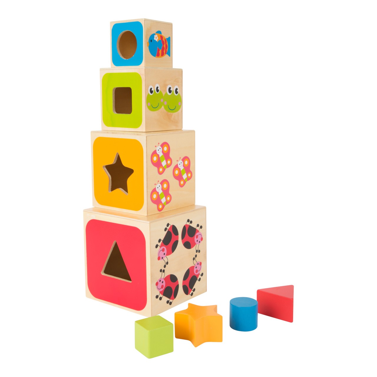 Dřevěné vkládací kostky učí děti geometrickým tvarům, barvám, číslům i písmenům. Geometrické tvary musí být vloženy přes správné otvory. Vytištěná písmena na kostkách musí být naskládána ve správném pořadí, což nabízí optimální výukový nástroj. Upevňuje jemnou motoriku dítěte. Roztomilé motivy zvířátek děti zaujmou a učení pro ně bude velkou zábavou. Hlavní vlastnosti: obsahuje 4 vkládací kostkyučí děti geometrickým tvarům, barvám, číslům a písmenůmprocvičuje jemnou motoriku dětí