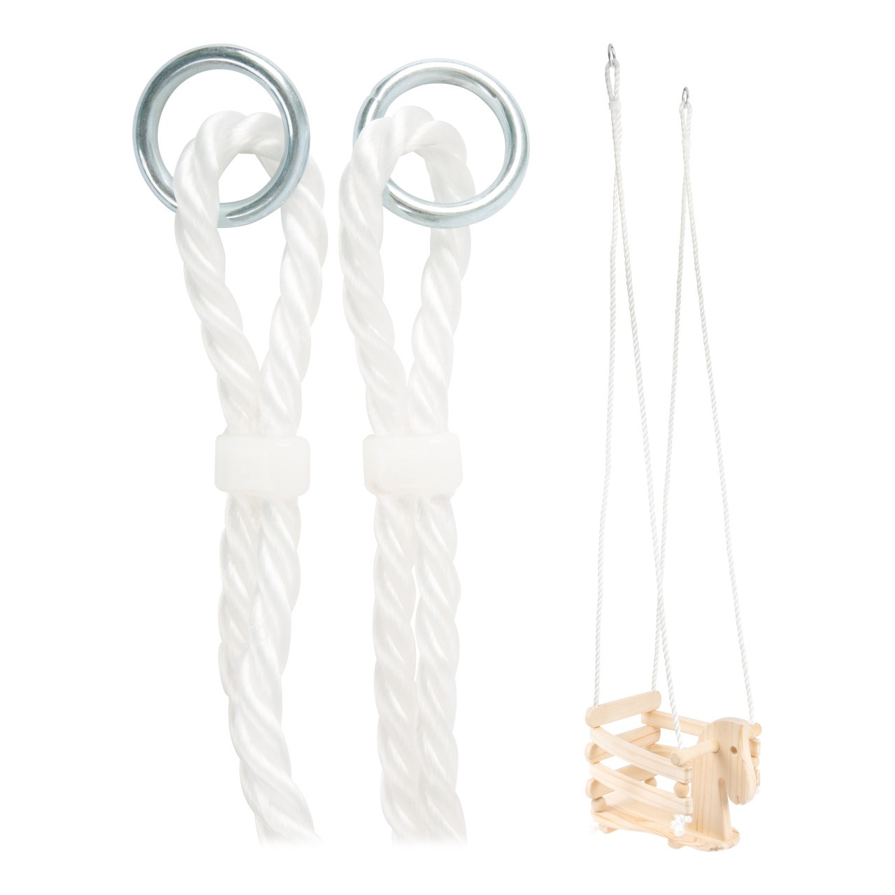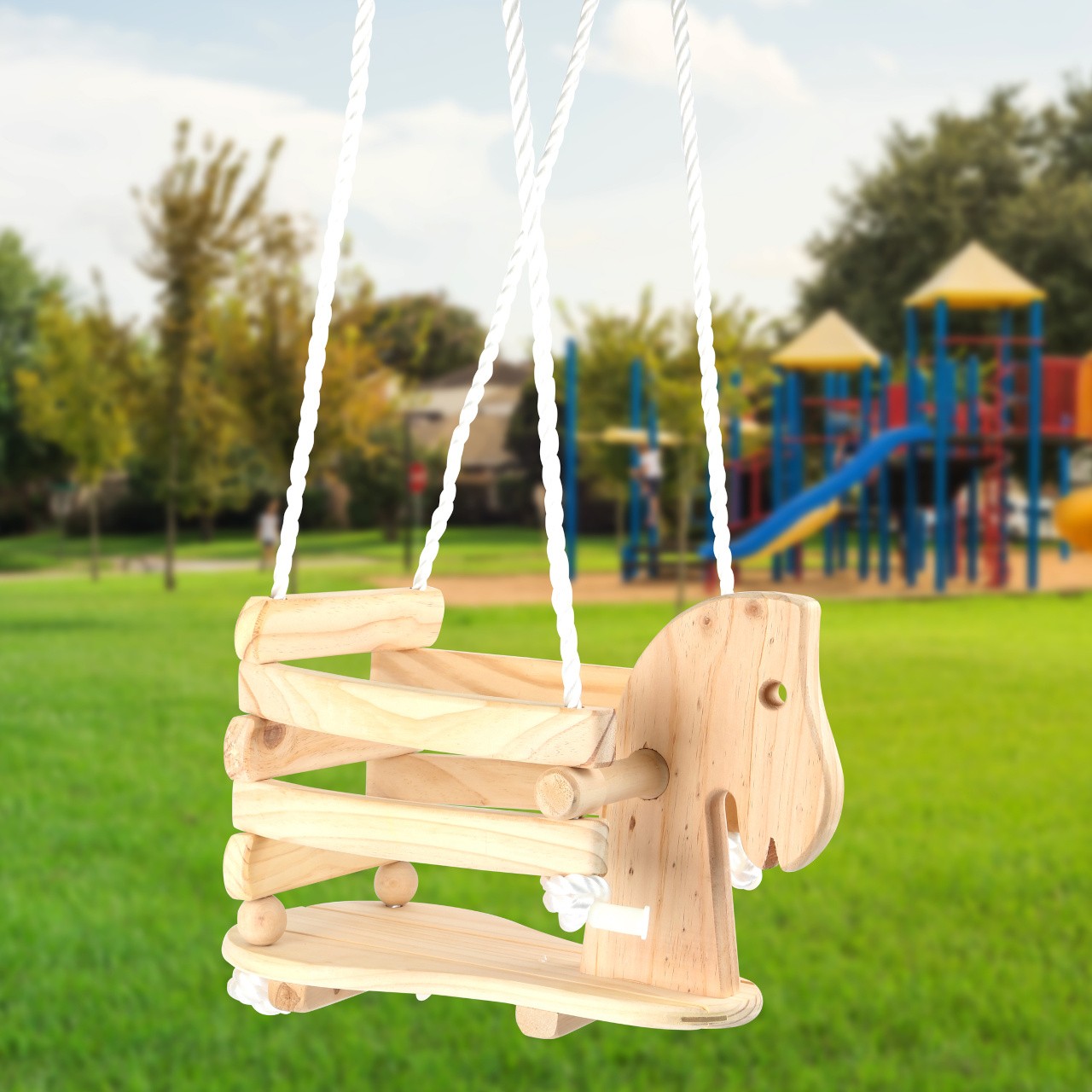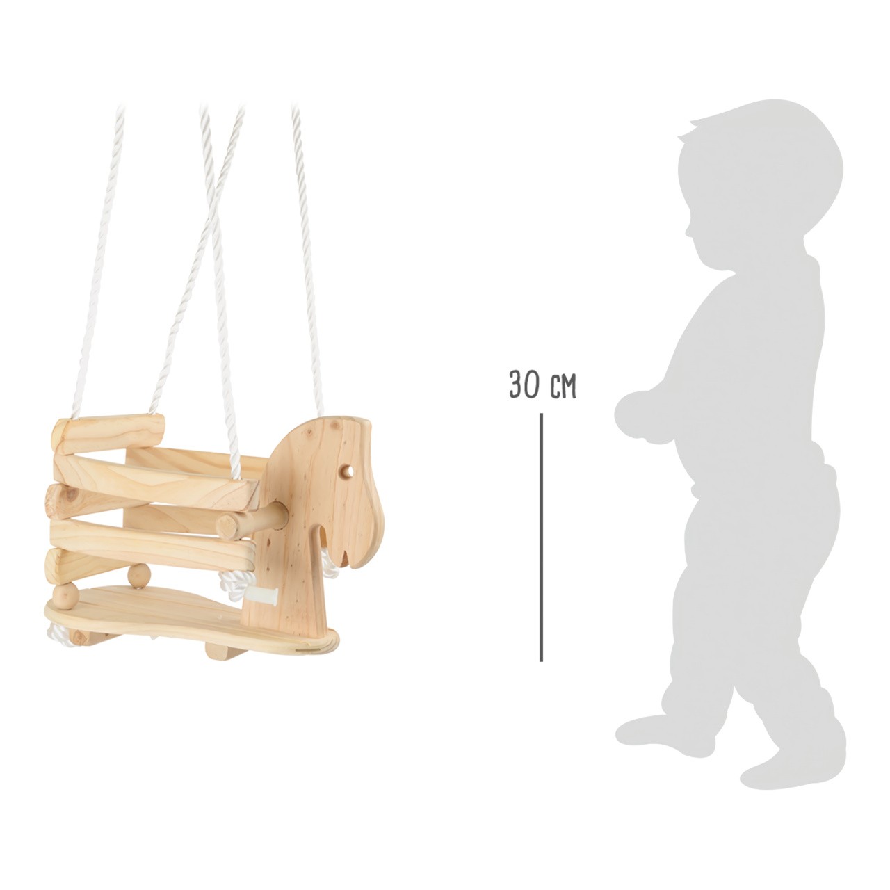 Hyjé, houpáním kupředu! Roztomilá houpačka s hlavou koníka je díky prostornému sedátku, opěrce a vyvýšenému hrazení nejen pohodlná, ale i velmi bezpečná. Po stranách nabízí madla, kterých se děti mohou pevně chytit, a houpání se tak stane ještě jistějším. Vyrobena je z pečlivě opracovaného dřeva a nabízí přírodní úpravu, kterou lze barevně upravit dle vlastní fantazie. Závěs je tvořen pevnými, odolnými, ale i poddajnými nylonovými lany, která jsou zakončena kovovými kroužky k zavěšení.   Hlavní vlastnosti:vyvýšené hrazení a madla pro větší bezpečnostnosnost 30 kgrobustní a odolné provedení z masivního dřeva