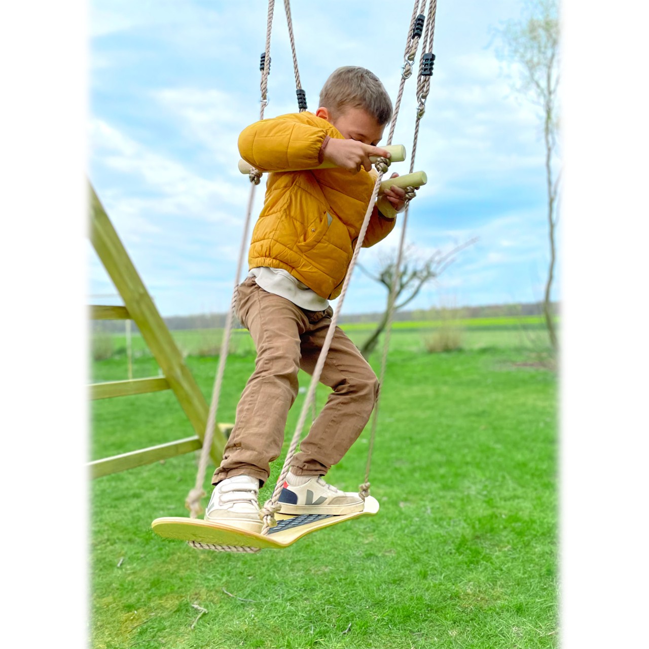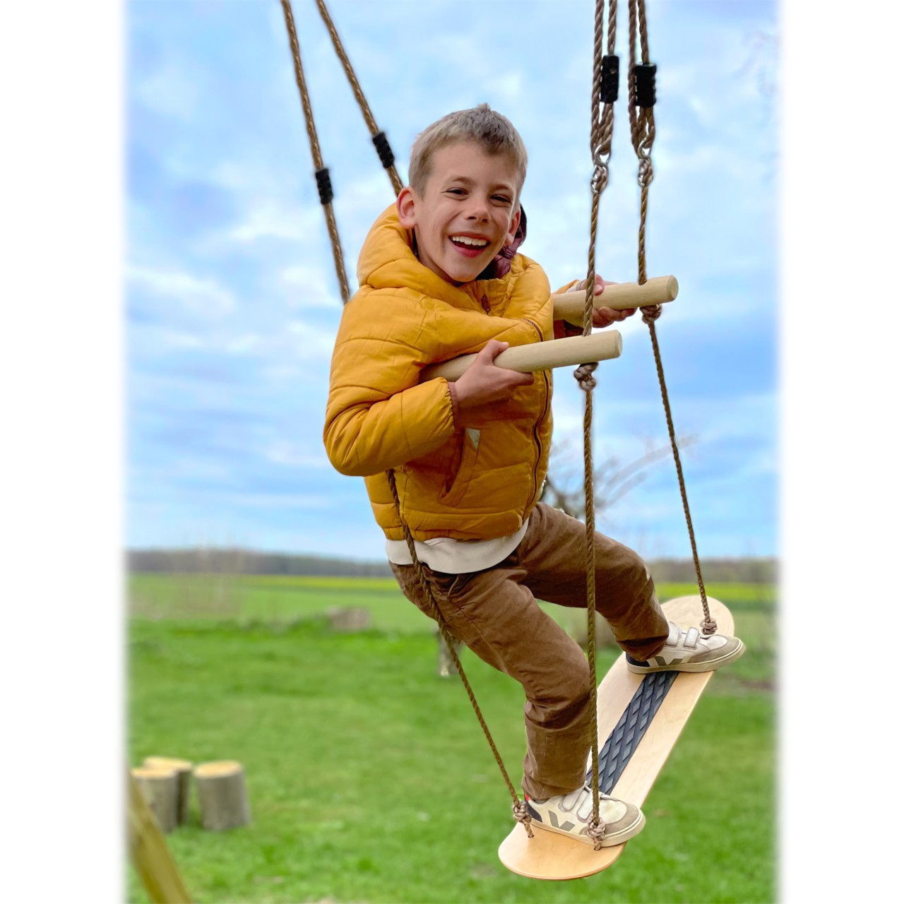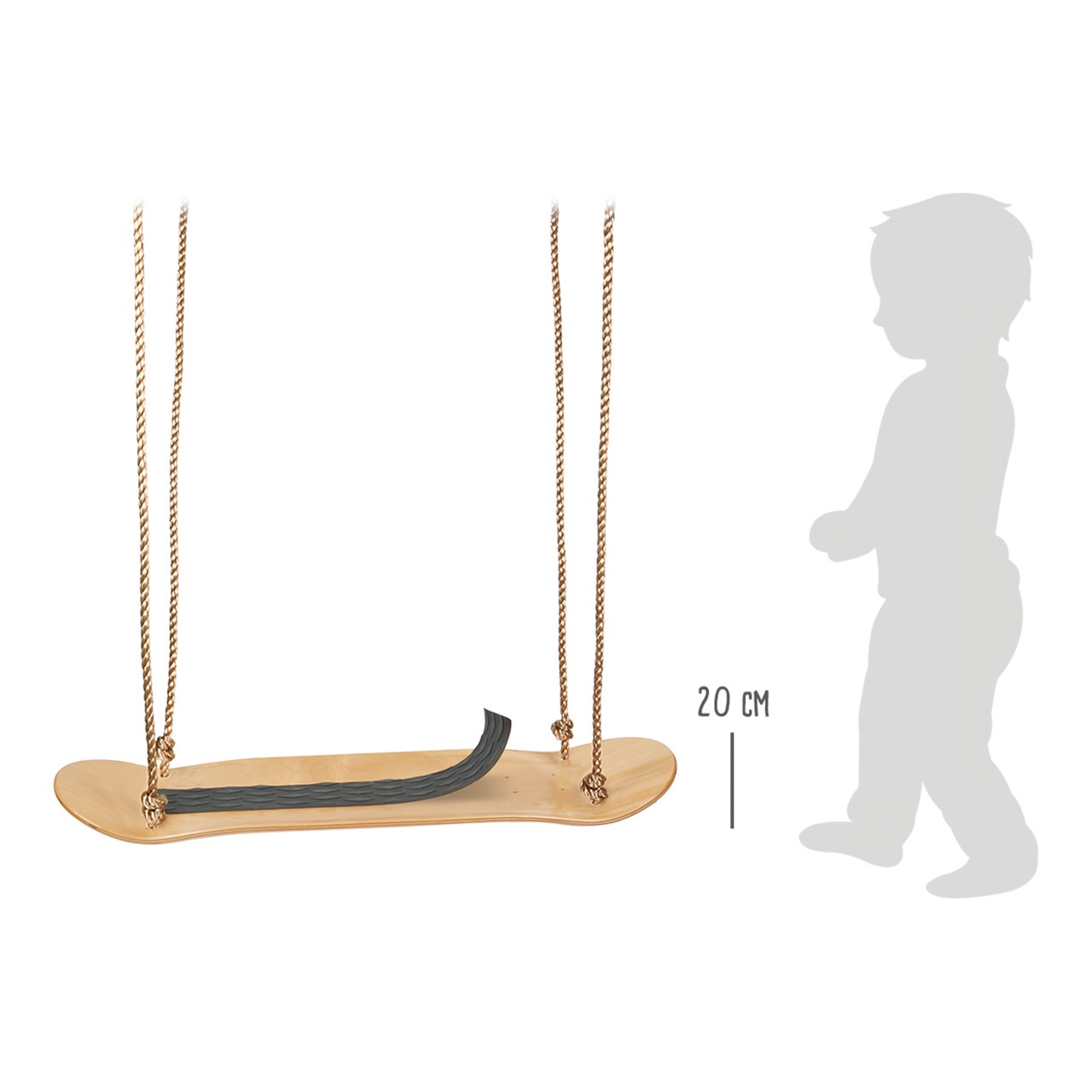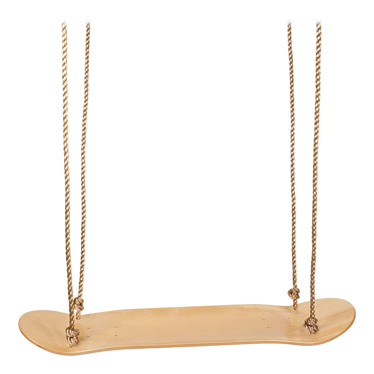 Houpejte se jako šampioni v netradičních sportech, na prkně připomínajícím skateboard! Děti na něm mohou nejen sedět, ale i stát jako na skutečném skateboardu! K ruce je jim přitom dvojice madel, jejichž výšku lze na laně snadno upravit. Součástí balení je také protiskluzová samolepka pro ještě větší jistotu při houpání ve stoje. Prkno je vyrobeno ze silné překližky a spolu s robustními madly z masivního dřeva je zavěšeno na vysoce odolných a poddajných nylonových lanech. Délku lan lze kdykoli snadno upravit pomocí kovových průvleků, na koncích jsou opatřena kovovými kroužky a bezpečnostními karabinami k zavěšení. Hlavní vlastnosti:madla a protiskluzová samolepka pro větší bezpečnostjednoduché nastavení délky lan a polohy madelnosnost 100 kgodolné provedení