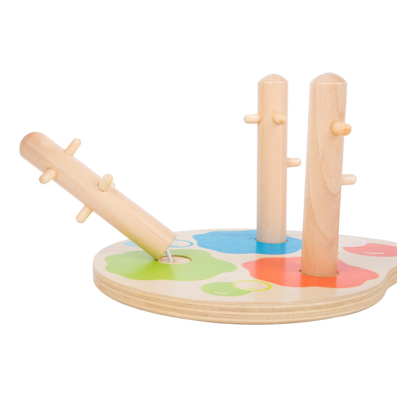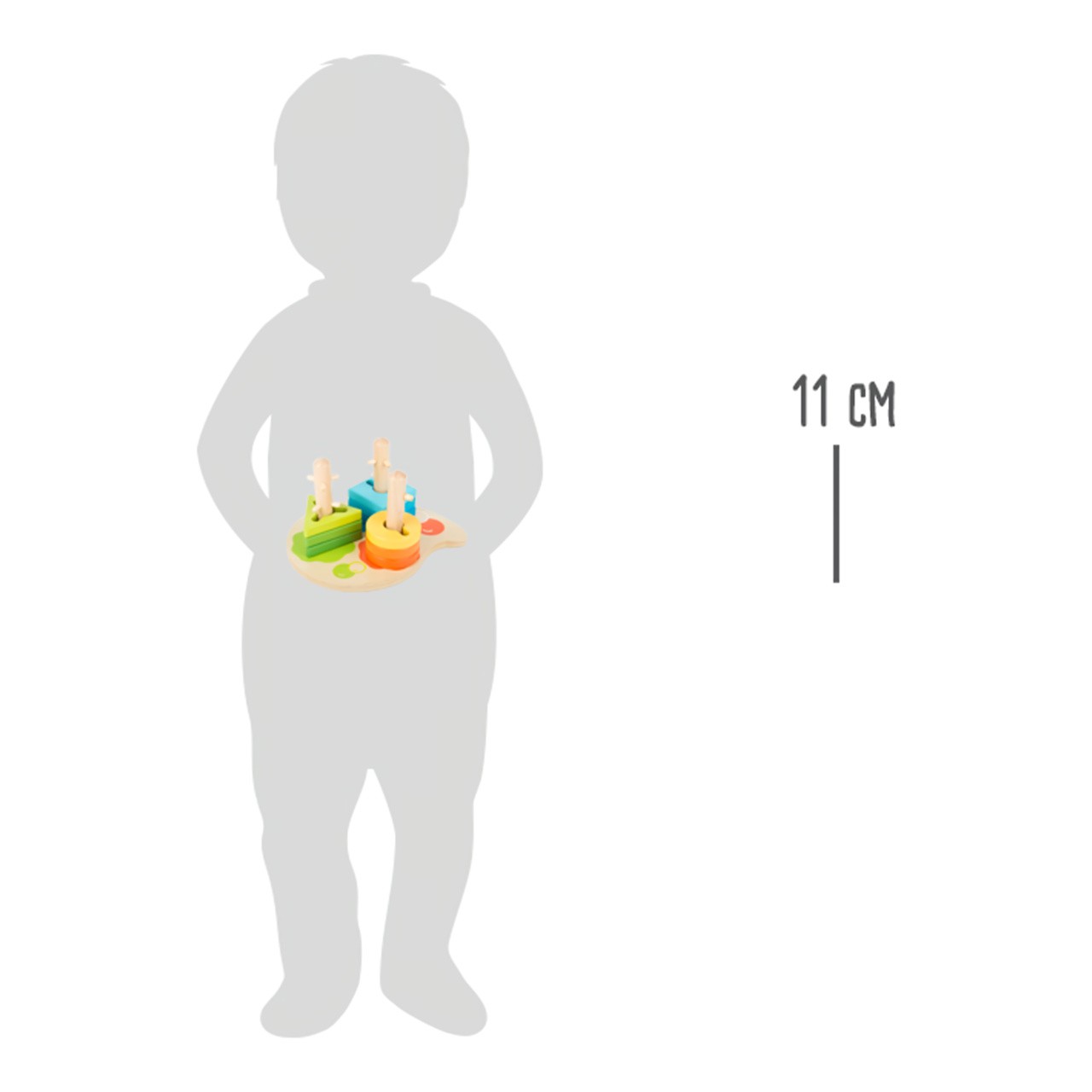 Pestrobarevná dřevěná motorická hračka ve stylu malířského plátna. Nejmenší umělci se mohou pokusit třídit dřevěné geometrické tvary jako trojúhelník, obdélník a kruh ke správné barvě na malířské paletě. Není to tak snadné, jak to vypadá, protože tvary je třeba skládat tak, aby jim překážky na pohyblivých dřevěných sloupech nebránily. Kdo je pro tuto výzvu? Hlavní vlastnosti: rozvíjí představivostmožnost naučit se barvy a tvaryprostorové povědomí a obratnostkoordinace rukou a očípomáhá učit se tvořivosti a logickému myšlení