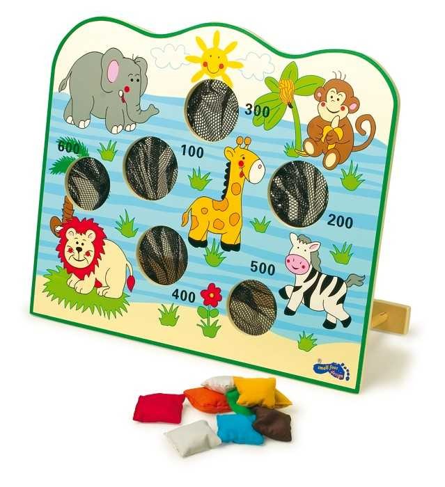 Barevná hra na házení do otvorů se síťkou malými barevnými pytlíčky. Otvory se liší velikostí a čím menší je otvor, tím těžší je se trefit. Ale počet bodů motivuje - zkuste to! Tato hra zabírá málo místa a je ideální pro hraní v místnosti! Hlavní vlastnosti: procvičuje koordinaci ruka-oko a motoriku