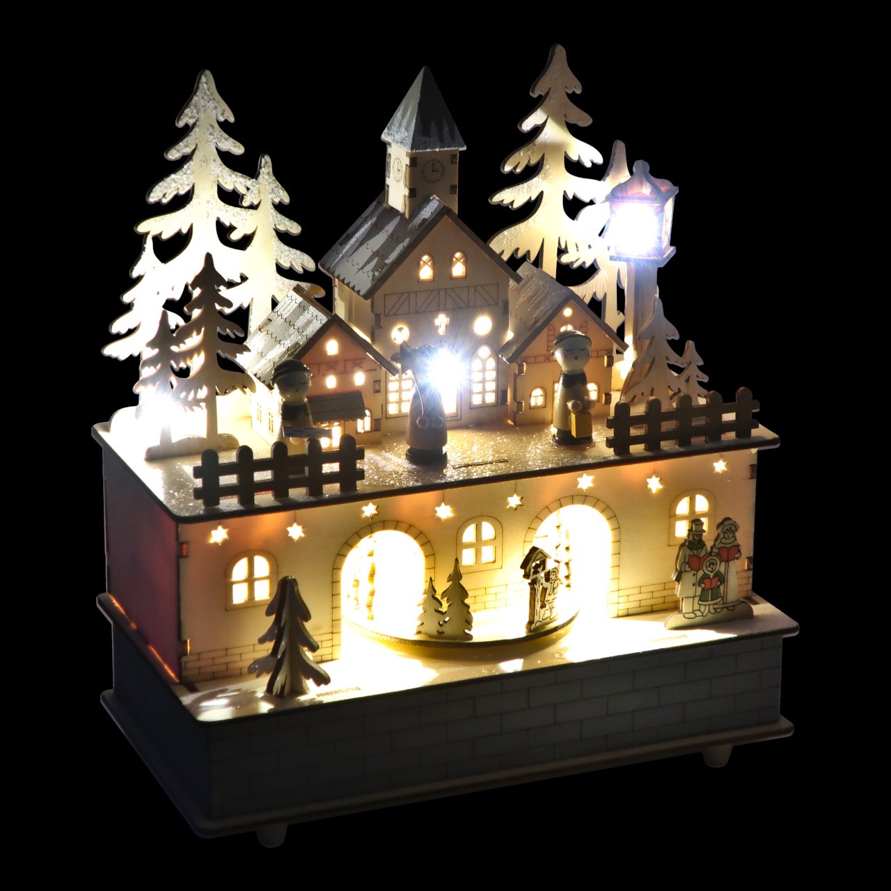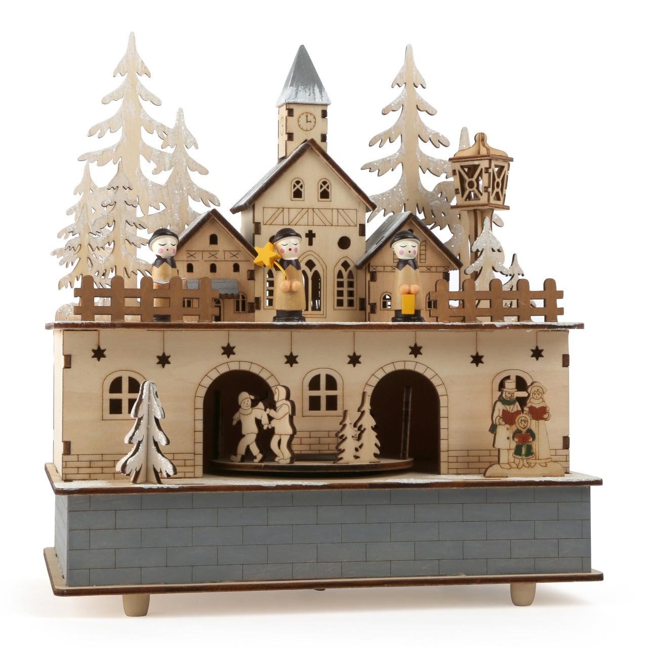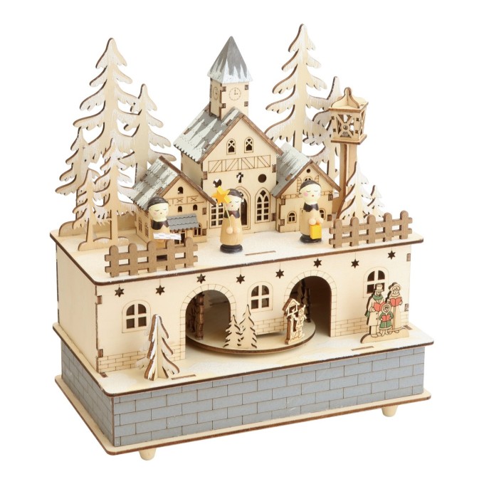 Vykouzlete si nejen vánoční atmosféru při pohledu na tančící postavičky v kouzelné vesnici. Při natažení hraje známá melodie a pod zasněženou osvětlenou krajinou tančí postavičky. Skříňka je dodávána ve složeném stavu. Osvětlení zajišťují LED zdroje světla s nízkou spotřebou energie, které napájí dvojice AA baterií (nejsou součástí balení). Hlavní vlastnosti: pohyblivé detailyvánoční melodieLED osvětlení (2×AA baterie nejsou součástí balení)