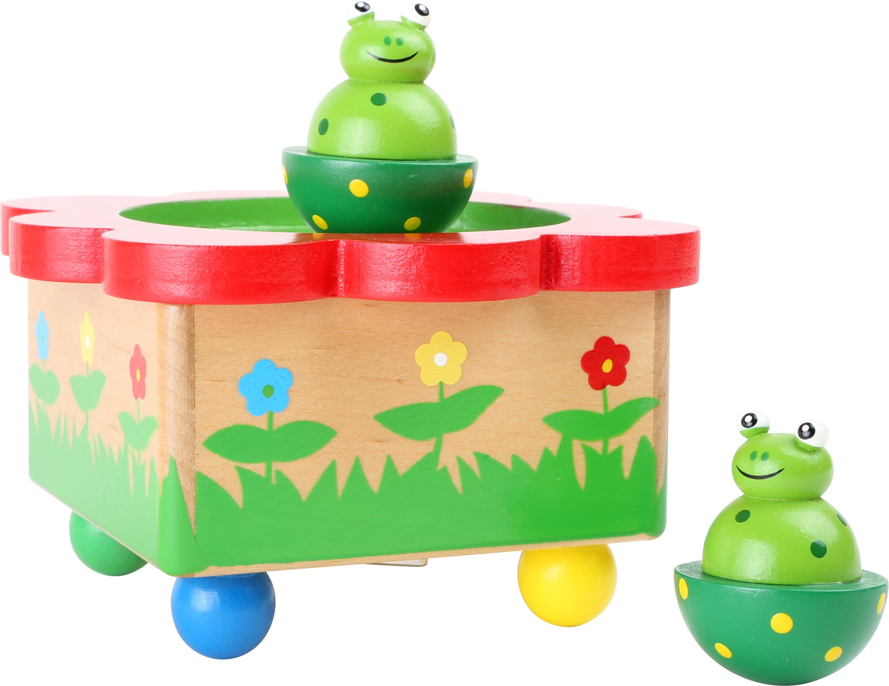 Co za píseň slýchám? Kdopak to tančí? Kvaky, kvak! Žabičky mají veselku a ty na ni nesmíš chybět! Malé žabky bezpečně drží na vrcholu dřevěné natahovací hrací skříňky pomocí magnetů. Lze je jednoduše oddělit a děti si s nimi mohou hrát na zemi, stole či postýlce. Díky snadnému ovládání mohou tuto hrací skříňku samostatně obsluhovat i děti. Hlavní vlastnosti: snadné ovládánípodporuje představivosthraje melodii "Merrily We Roll Along"