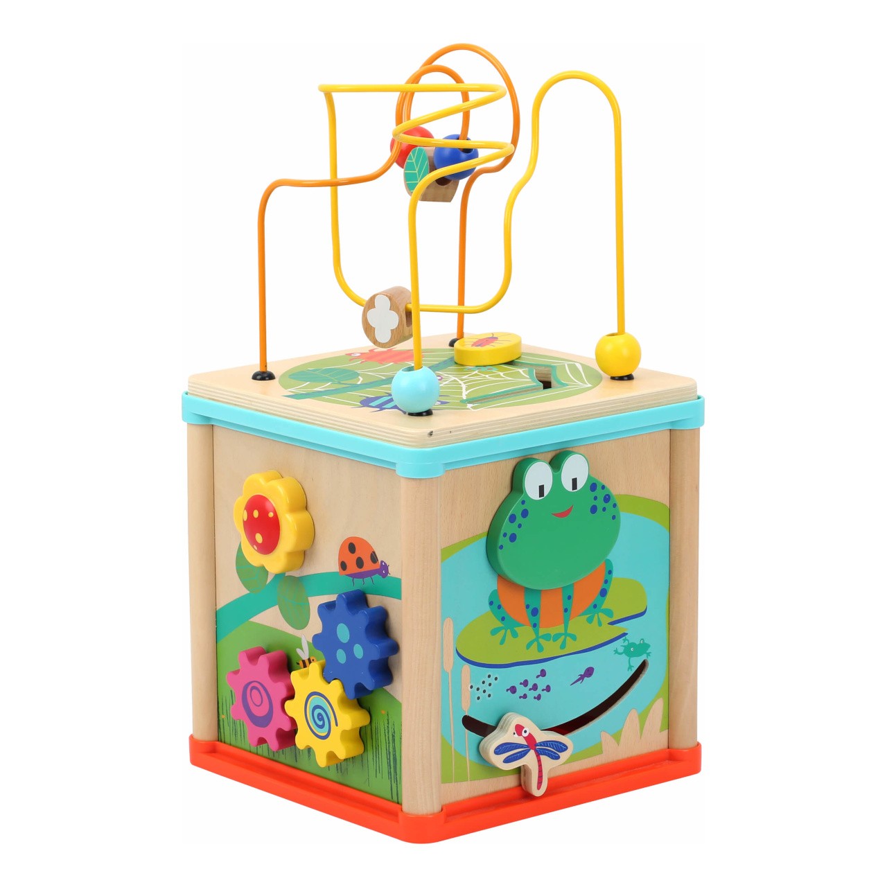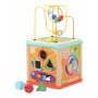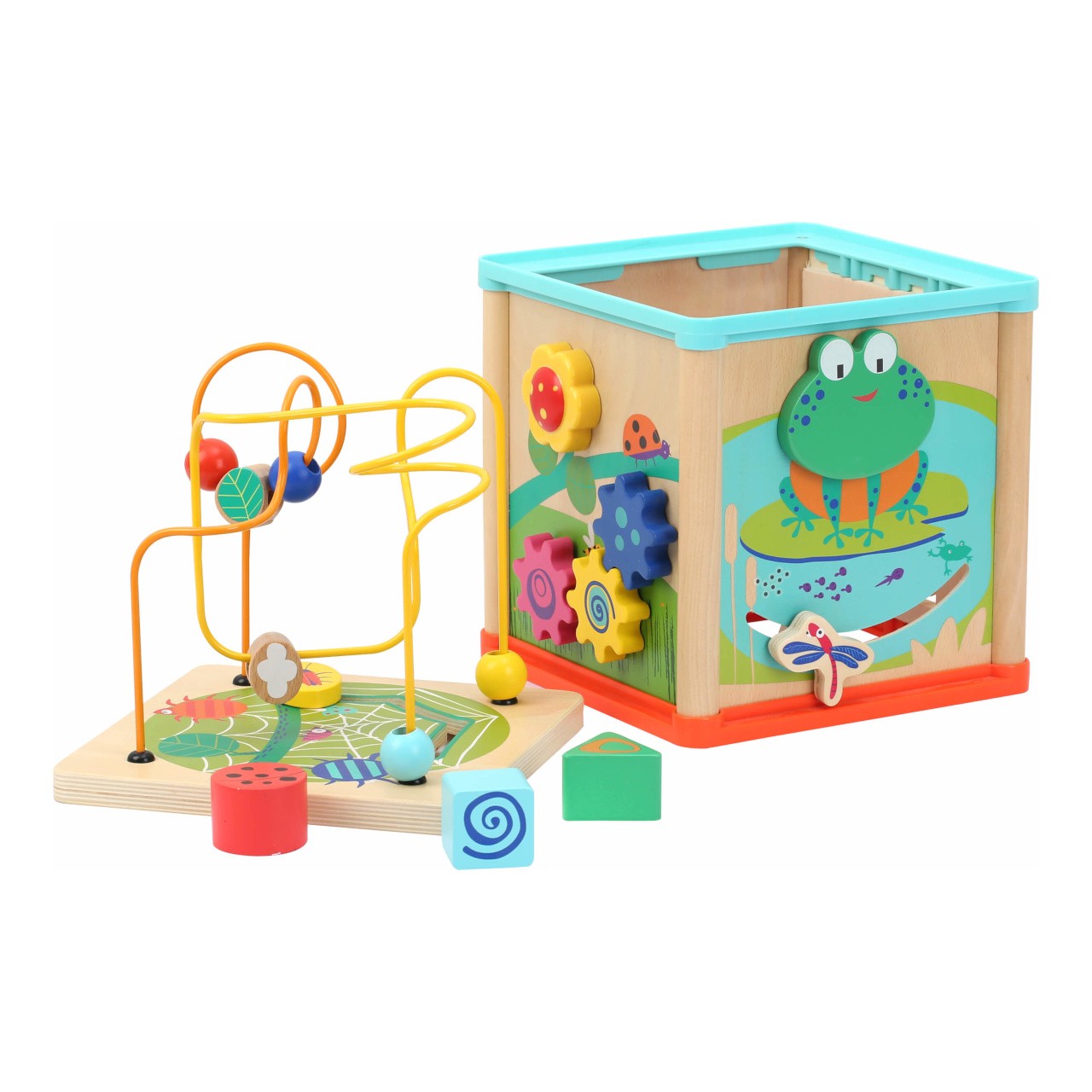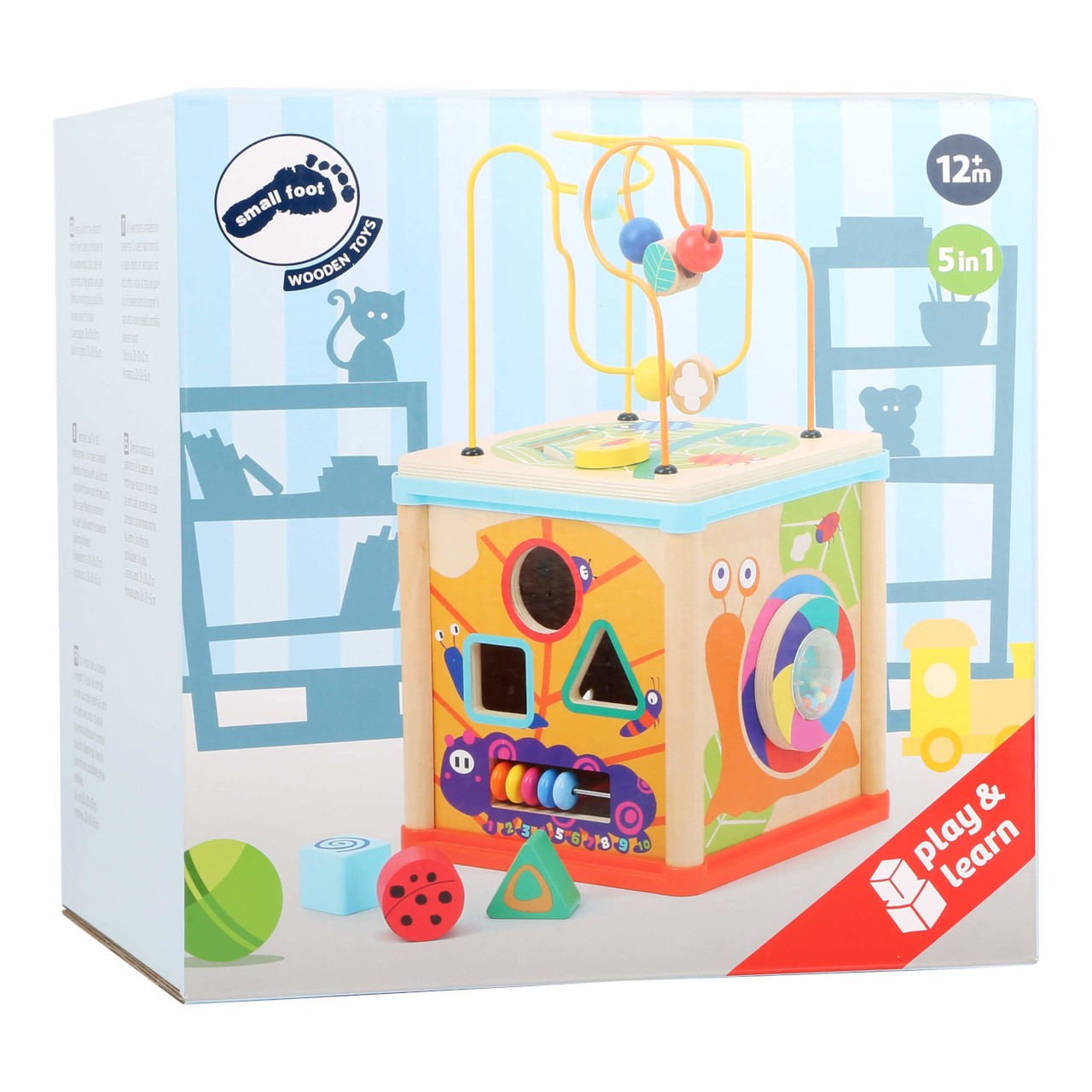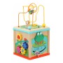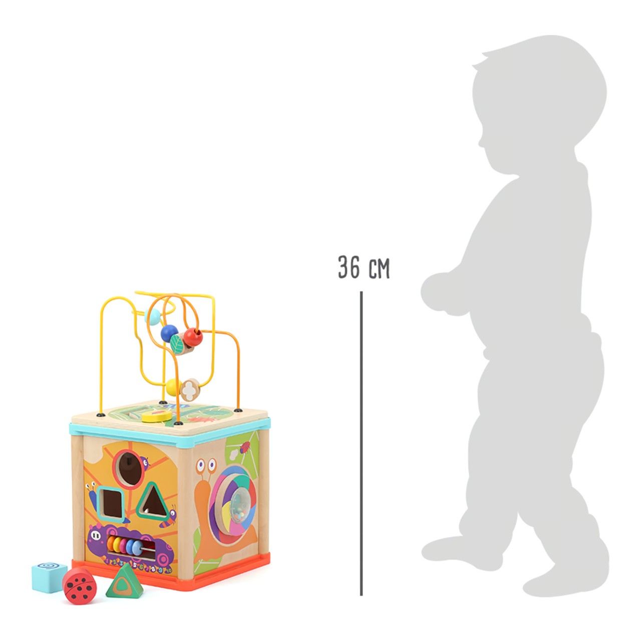 Motorická kostka nabízí na svých stěnách mnoho příležitostí ke hrám a zábavě. Dětskou zručnost a orientaci v prostoru lze přirozeně rozvíjet korálkovým bludištěm na víku, vkládačkou, nebo ozubenými kolečky. Kostka je bohatě dekorována pestrobarevnými motivy s mnoha roztomilými zvířátky, ty mohou zároveň s rozmanitými tvary, chrastítkem a dalšími atrakcemi pomoci různými způsoby zdokonalovat poznávací dovednosti dětí. Hračka je vyrobena ze silné překližky a odolného nezávadného plastu, můžet tak nabídnout vysokou životnost. Díky otočnému víku je prakticky skladná a lze ji hravě umístit do poličky, kterou zpestří svou barevností. Hlavní vlastnosti:kostka s víkem a 3 díly vkládačky5 stěn s různými atrakcemirobustní a odolné provedení