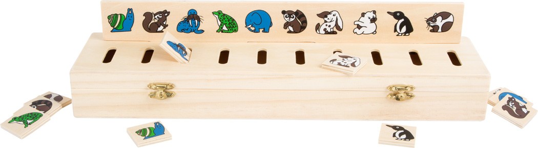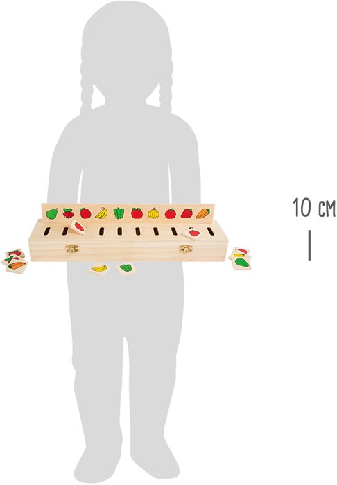 Tato pěkná krabička má 5 zásuvných desek a 50 čtverečků se symboly. Je to dřevěná vkládací hra, která trénuje rozeznávání barev a různých předmětů – oblečení, zvířata, ovoce. Najdete zde ale také geometrické tvary a číslice. Čtvercový dílek s motivem spárujte a poté vhoďte do správného otvoru. Všechny dílky mohou být uloženy do vkládačky, víko je bezpečně uzavíratelné pomocí 2 západek. Hlavní vlastnosti: hra pomáhá s rozpoznáváním tvarů a barevrozvíjí řeč dětívelmi oblíbená hra
