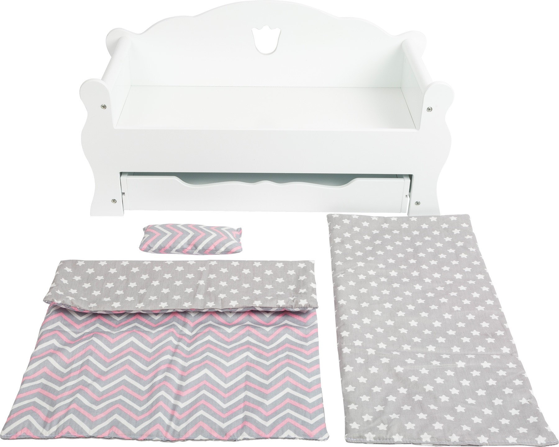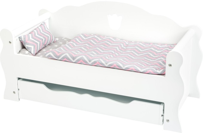 Tuto elegantní postel lze v mžiku proměnit na komfortní pohovku, a tak si najde své využití ve dne i v noci. Do praktického úložného prostoru schováme peřinku a polštář nebo jej využijeme jako místo pro dalšího spáče. Panenky či plyšáci jistě ocení možnost se po náročném dni natáhnout a odpočinout si. Hlavní vlastnosti: vhodné pro panenky do 45 cmpraktický výsuvný úložný prostor pod postelísoučástí matrace, peřinka a polštář