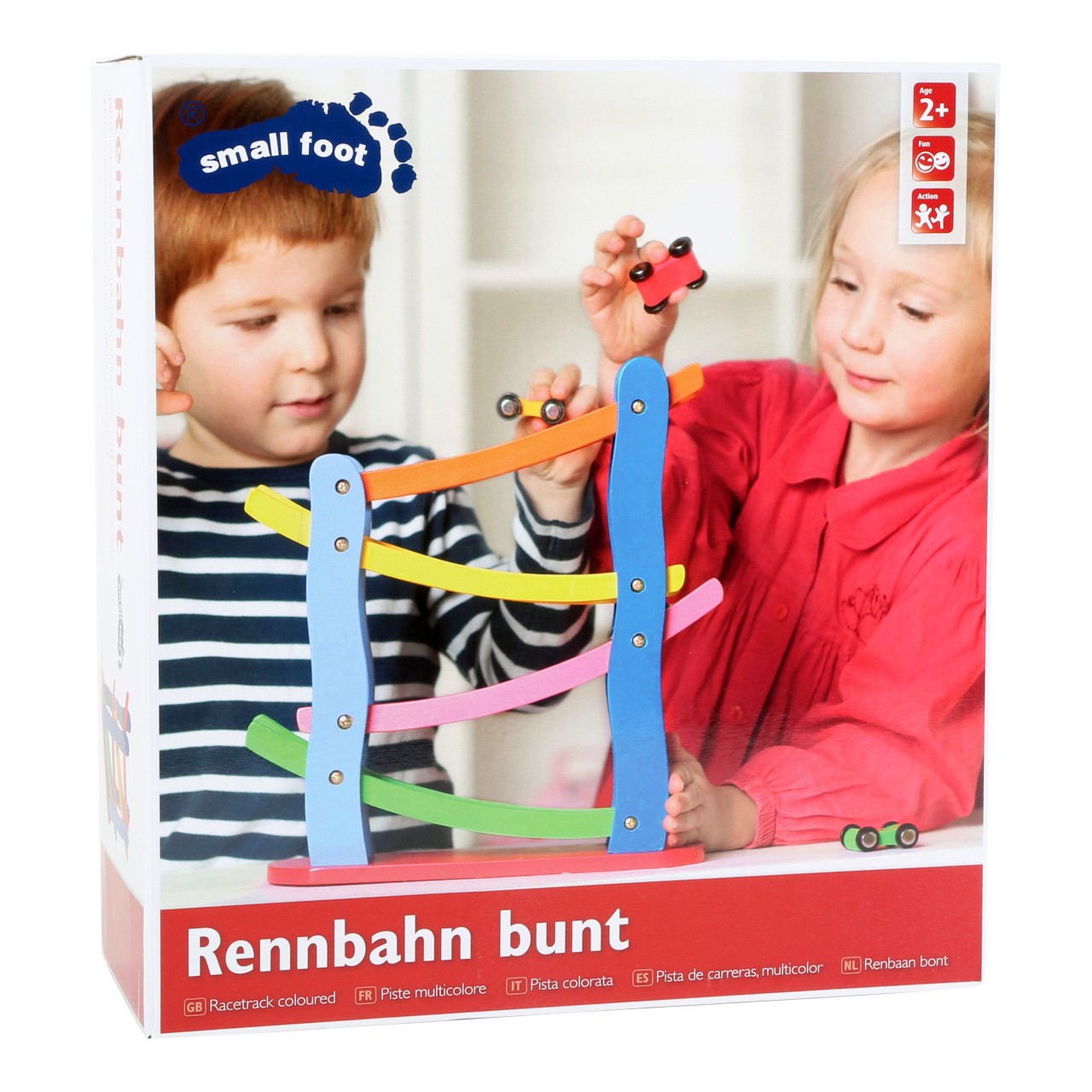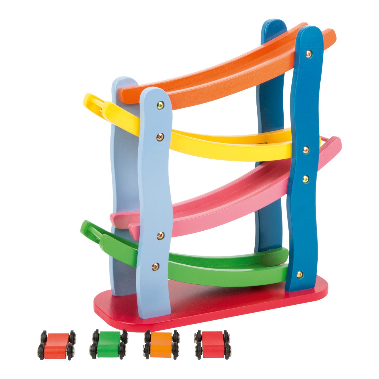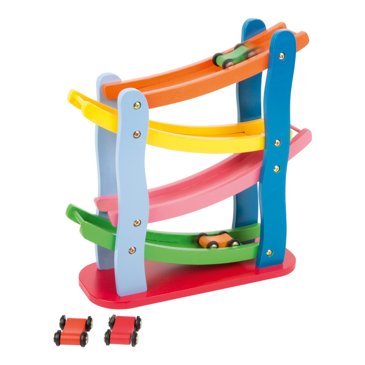 Tato závodní dráha z barevného dřeva je „Formulí 1“ mezi kaskádovými dráhami. Čtyři malá barevná auta uhánějí po stabilní dřevěné závodní dráze a přitom dělají kotrmelce. Dřevěná auta se snadno drží a jsou připravena na další rychlý sjezd.Hit pro všechny děti, které mají rády rychlá auta! Hlavní vlastnosti: zábava na dlouhé hodinyrozvíjí motoriku a učí rozpoznávat barvy4 ideálně velká autíčka v balení