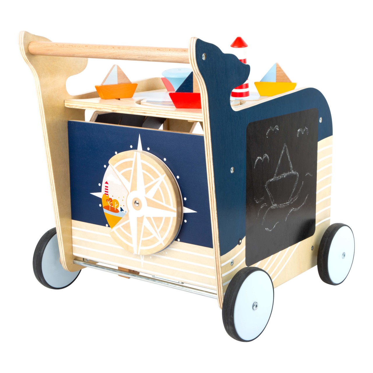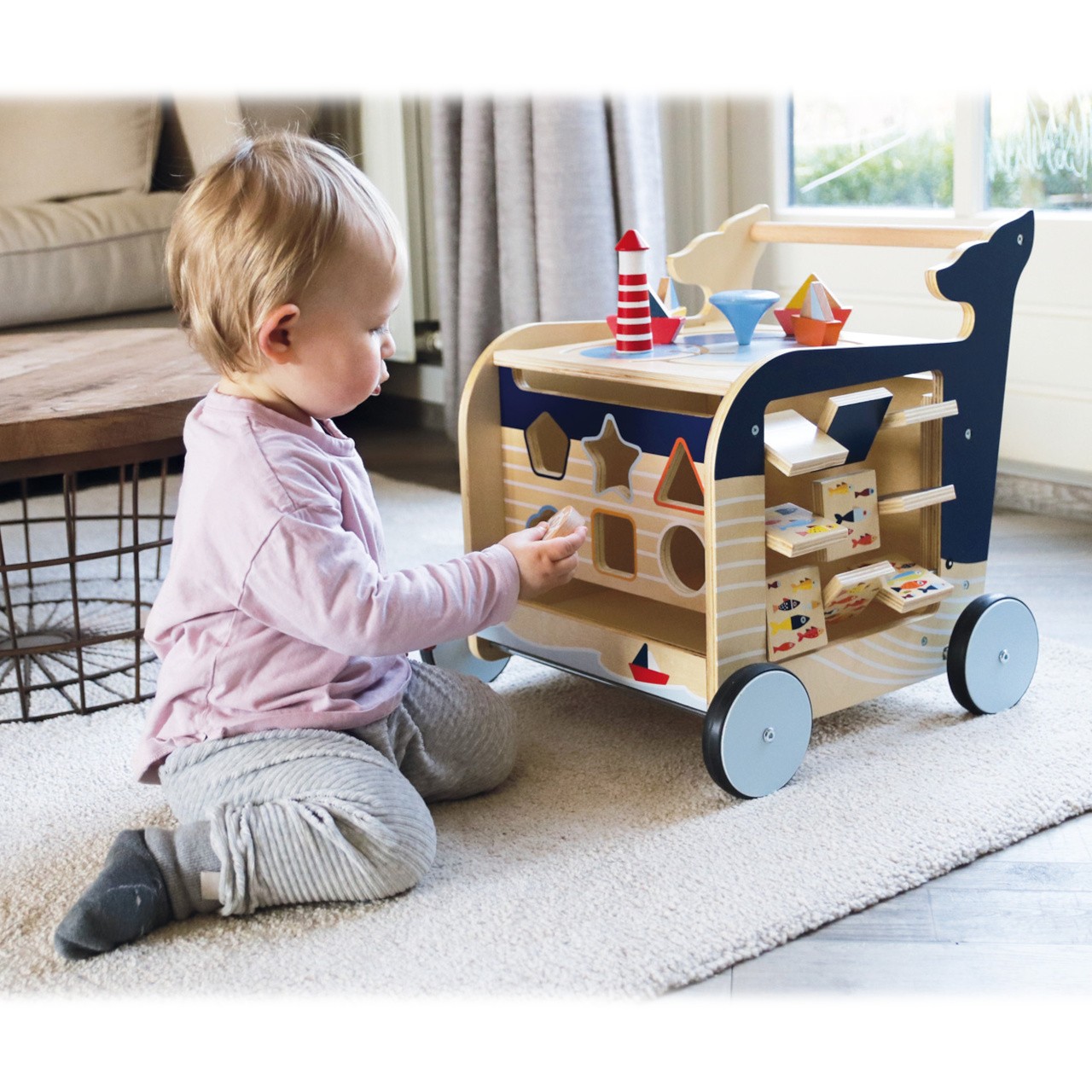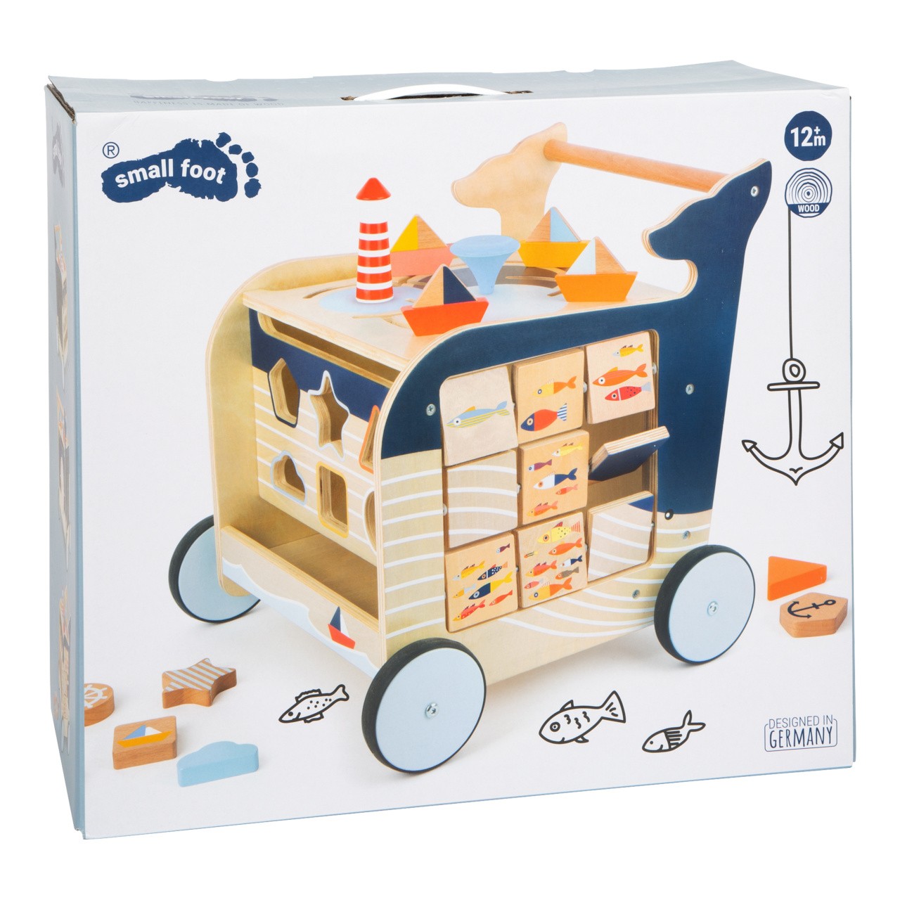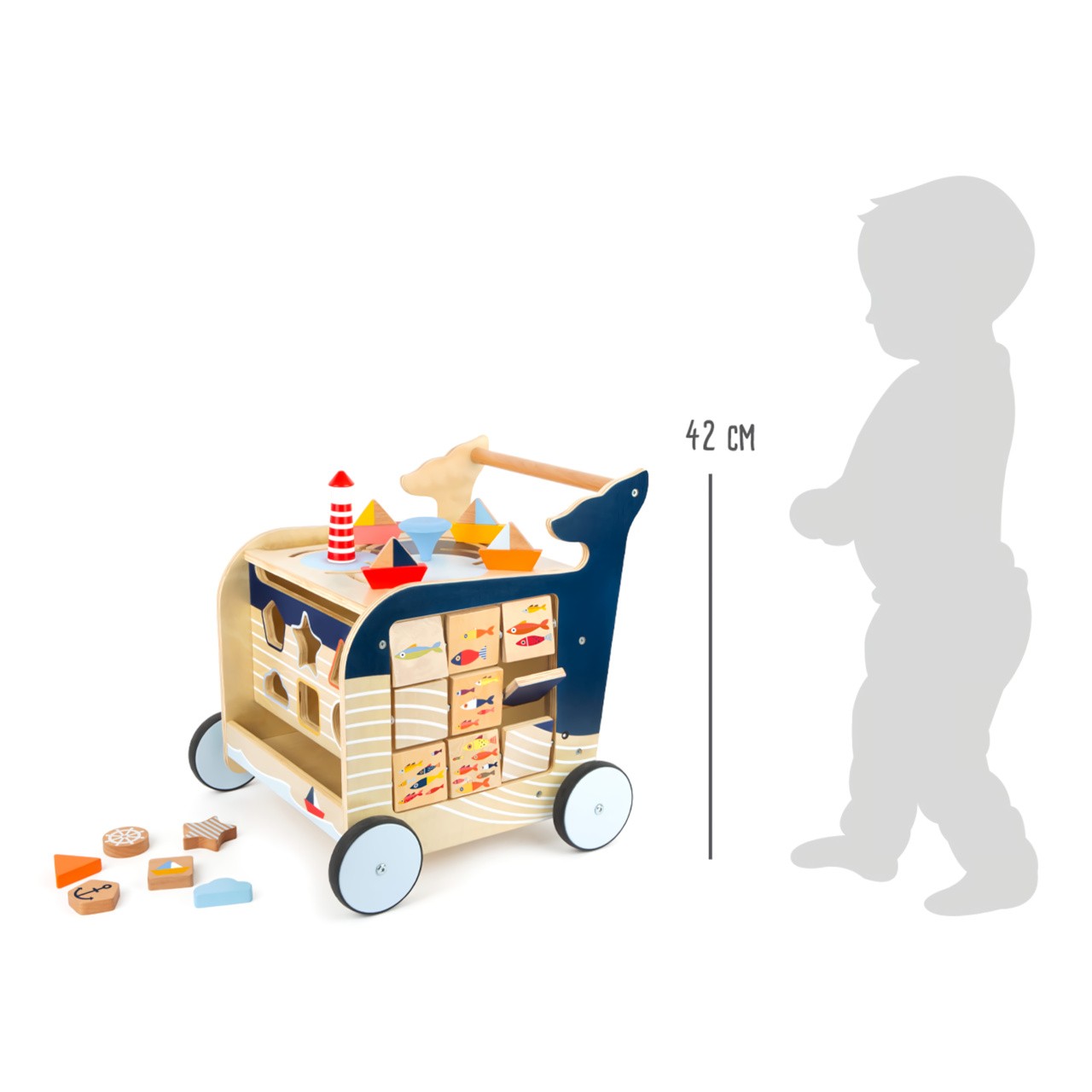 Pojďme na průzkum s velrybou! Toto dřevěné chodítko ve tvaru velryby pomůže dětem s prvními kroky a zároveň nabídne hračky k rozvoji motoriky. Chodítko se drží stylu mořského světa a jeho živočichů. Na čtyřech stranách chodítka naleznete hry jako vkládání tvarů, otáčení obrázků nebo kreslící tabulku. Děti se mohou naučit počítat, určovat světové strany nebo rozlišovat roční období. Chodítko má pogumovaná kola a je tak tiché a zároveň bezpečné. Chodítko je nahoře otevíratelné a dvířka obsahují pojistku proti přivření prstů. Můžete do něj tedy uložit všechny kostky. Najdete zde i brzdný systém, který zabrání nehodám. Hlavní vlastnosti: multifunkční hračkapodporuje hravost a rozvoj motoriky