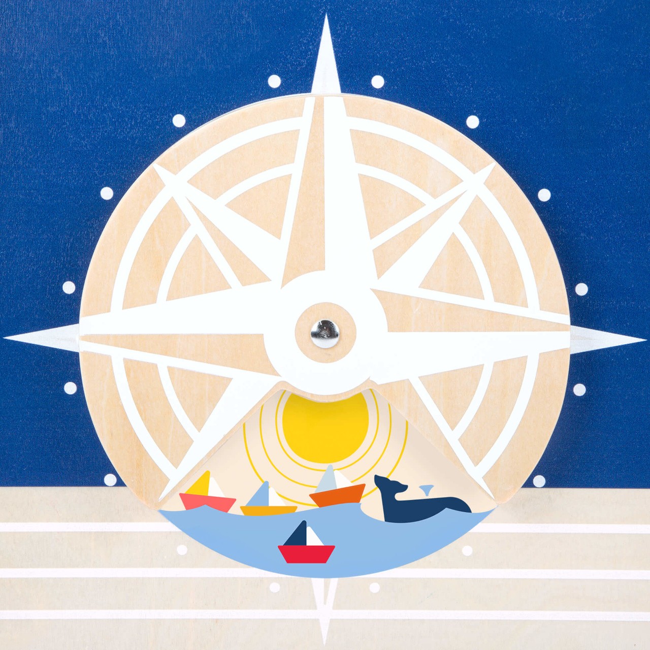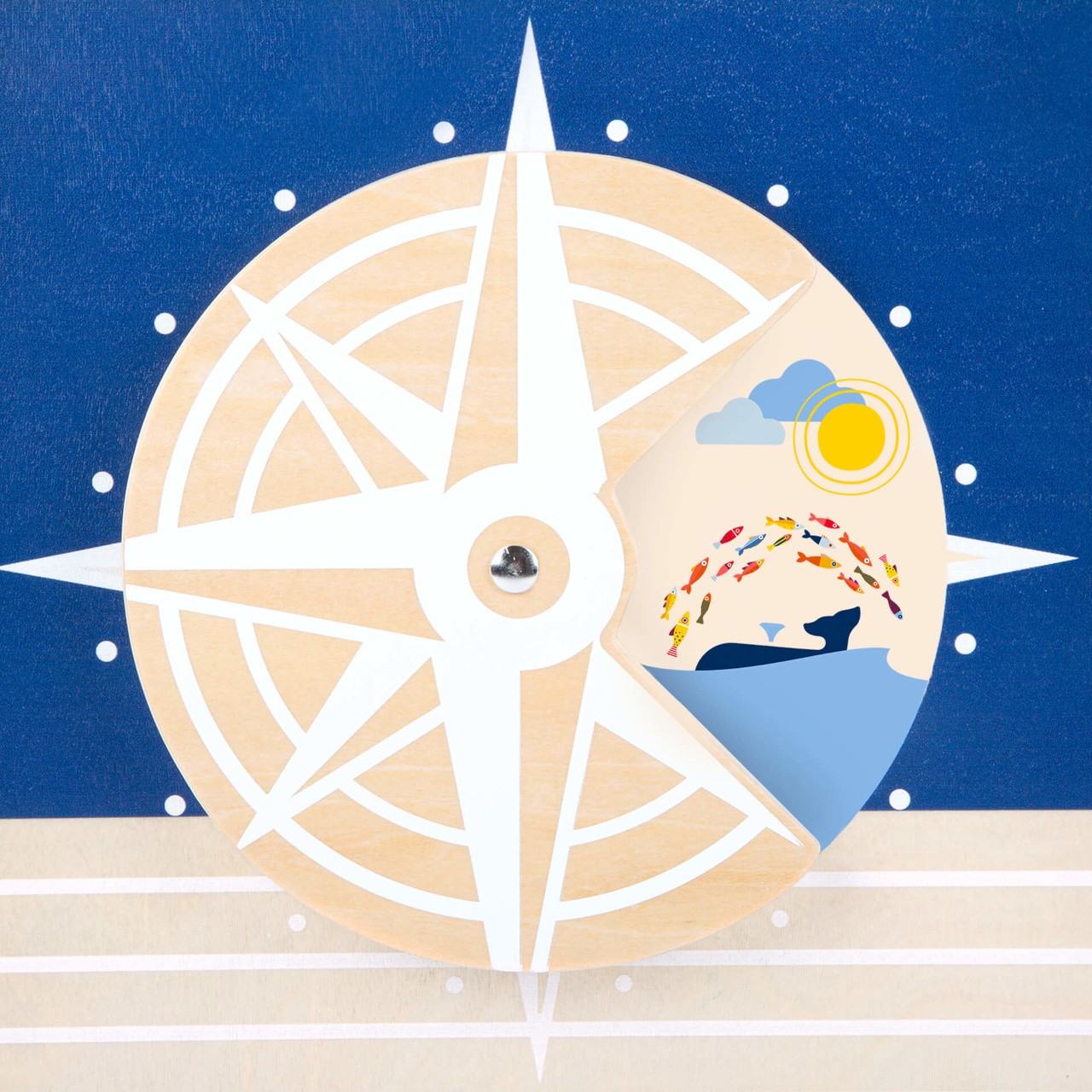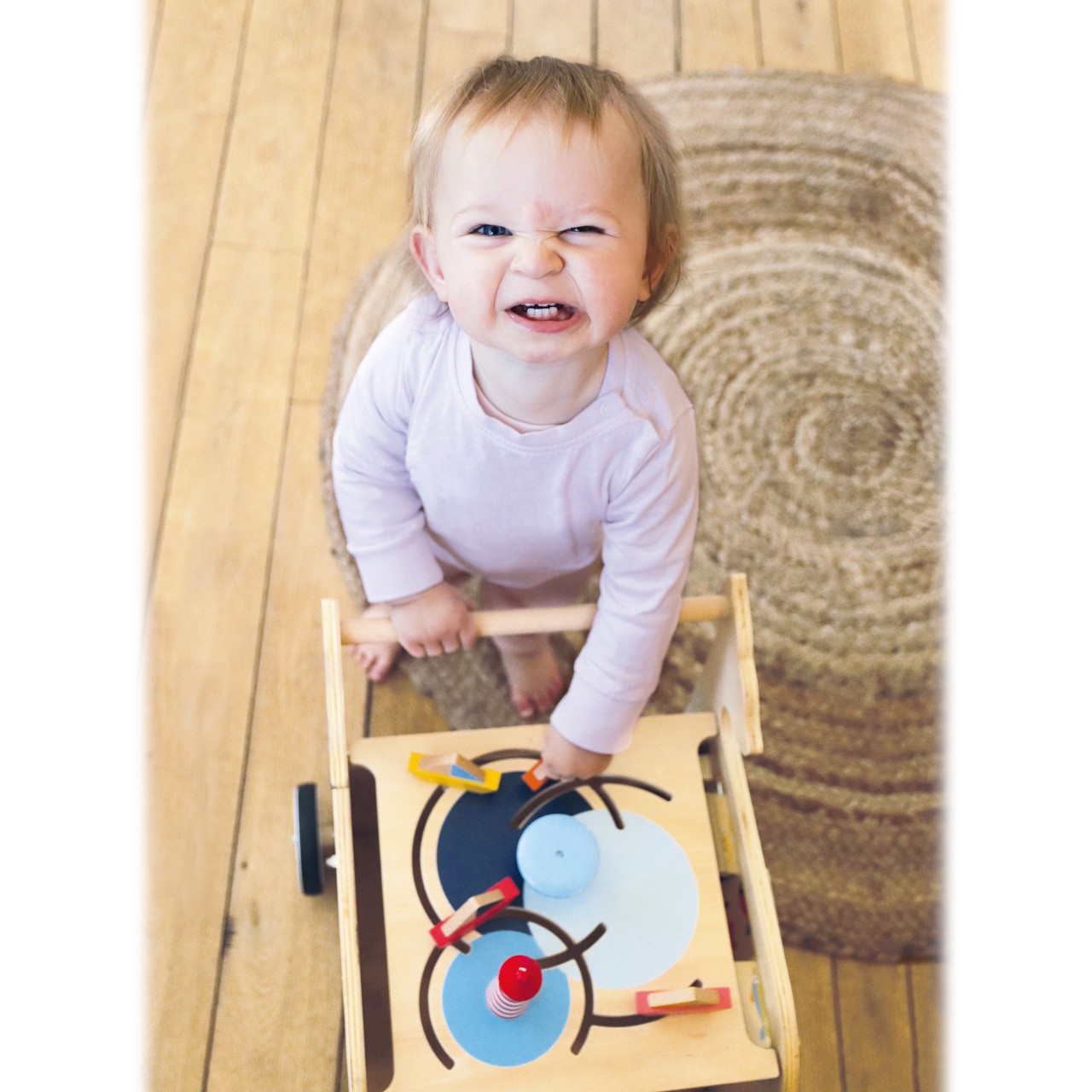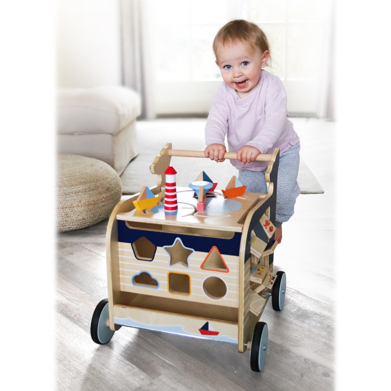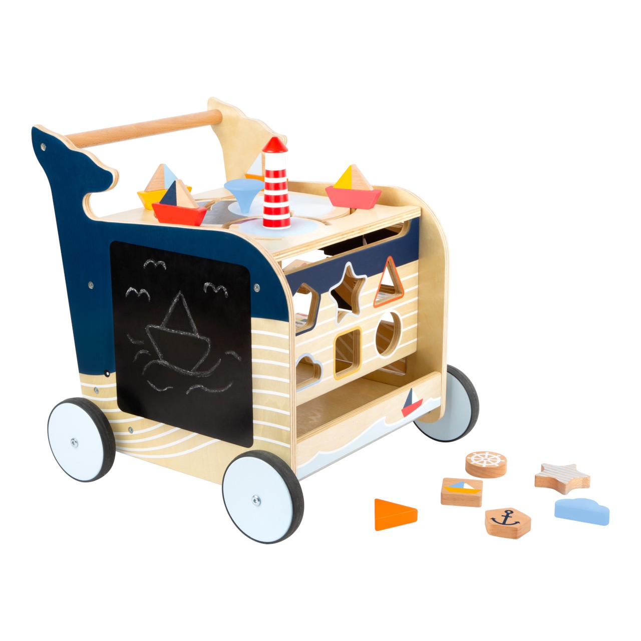 Pojďme na průzkum s velrybou! Toto dřevěné chodítko ve tvaru velryby pomůže dětem s prvními kroky a zároveň nabídne hračky k rozvoji motoriky. Chodítko se drží stylu mořského světa a jeho živočichů. Na čtyřech stranách chodítka naleznete hry jako vkládání tvarů, otáčení obrázků nebo kreslící tabulku. Děti se mohou naučit počítat, určovat světové strany nebo rozlišovat roční období. Chodítko má pogumovaná kola a je tak tiché a zároveň bezpečné. Chodítko je nahoře otevíratelné a dvířka obsahují pojistku proti přivření prstů. Můžete do něj tedy uložit všechny kostky. Najdete zde i brzdný systém, který zabrání nehodám. Hlavní vlastnosti: multifunkční hračkapodporuje hravost a rozvoj motoriky