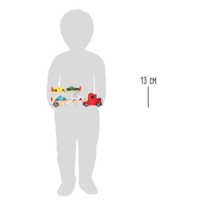 Pozor, zde se nakládají břemena! Chcete-li převézt nové modely aut z místa A na místo B, budete určitě potřebovat tento auto-přepravník. Naložit lze čtyři auta. Dřevěná auta mohou pohodlně vyjet na nákladní rampu. Zvednutá plocha opatřena závorou zabrání nechtěnému couvnutí aut. Včetně čtyř dřevěných aut v designu sportovních vozů. Přívěs se připojí k tahači a vše je připraveno na dlouhou a bezpečnou cestu. Ideální pro fanoušky aut a skvělý doplněk do vozového parku autíček v dětském pokoji. Hlavní vlastnosti: vyrobeno z robustního dřeva v pestrobarevném provedení pohyblivá horní plošina pro snadné nakládání a vykládání včetně čtyř autíček