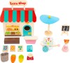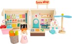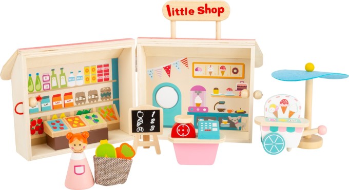 Pojďme nakupovat! Tento kompaktní obchůdek v dřevěném kufříku má šikovný zámek a najdete v něm zmrzlinový stánek, slunečník, několik kusů ovoce a zeleniny, pokladnu, váhu, reklamní tabuli a postavičku prodavačky. Hračku lze jednoduše přenášet a děti si tak mohou hrát i na cestách. Hlavní vlastnosti: obsahuje 15 ks příslušenstvípestrobarevné dřevěné provedeníkompaktní, přenosný kufříkpodporuje hraní rolí a představivost