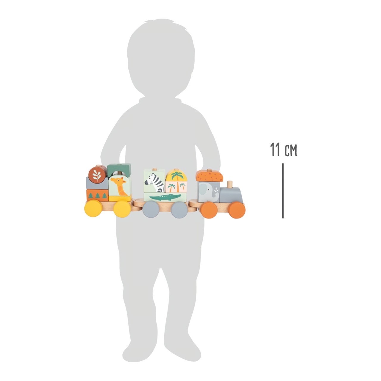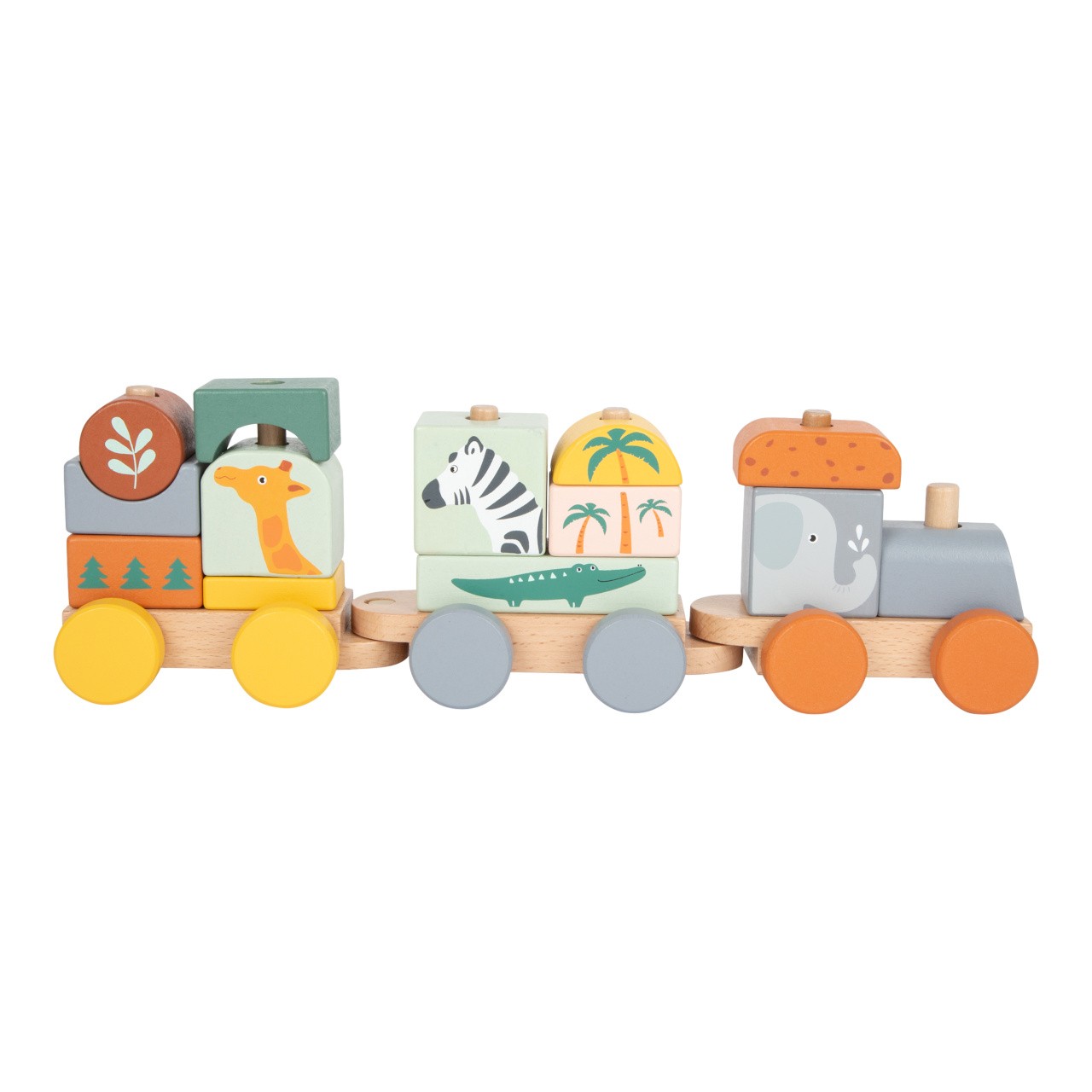 Složte jej a vyražte ze stanice! Tento dřevěný vláček v trendy barvách se rozjede až po nastoupení všech pasažérů – zebry, slona, žirafy a krokodýla. Vláček s mnoha detaily je zároveň nasazovací hračkou, která dává dětem volnost při skládání – každá kostka pasuje na více míst. Příští zastávka: Safari!  Hlavní vlastnosti: ilustrováno v pastelových barváchobsahuje 1 lokomotivu, 2 vagóny a 13 dílůtrénuje motoriku a představivost