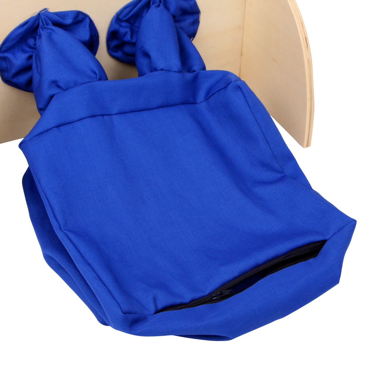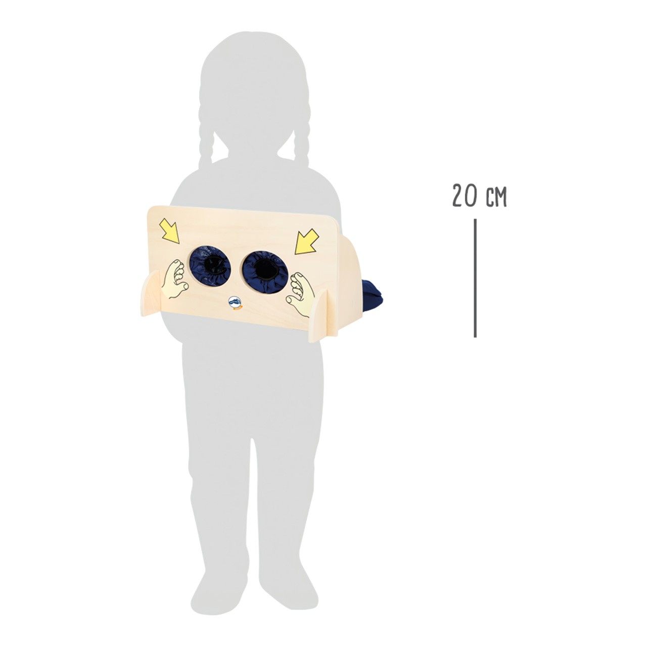 Různé předměty ukryjte do látkového pytlíku za dřevěnou stěnou. Pytlík je opatřen zipem, pro snadnější vkládání předmětů. Děti vloží ruce do textilních rukávů a podle hmatu se snaží rozpoznat, o jaký předmět se jedná. Hlavní vlastnosti: hra je vhodná také do školek nebo družinpomáhá rozvoji poznávacích a motorických dovedností