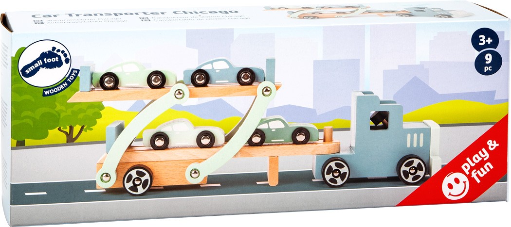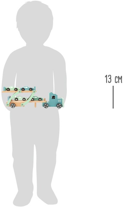 Velká kola jedou! Tento kamión s návěsem na automobil vychází z velkých mezikontinentálních kamionů a inspiruje barevným schématem „modré oceli“. Transportér je kompletně vyroben z přírodního dřeva. Díky tomu je ideální pro dlouhodobý herní zážitek. Dva ze čtyř turborychlých sportovních vozů se jednoduše naloží na sklopnou horní palubu - to zajistí nakládací rampa. Skvělý transportér automobilů, který by neměl chybět v žádném dětském pokoji. Hlavní vlastnosti: sklopný návěs pro 4 autaobsahuje 9 částíklasický design v modrošedé barvě