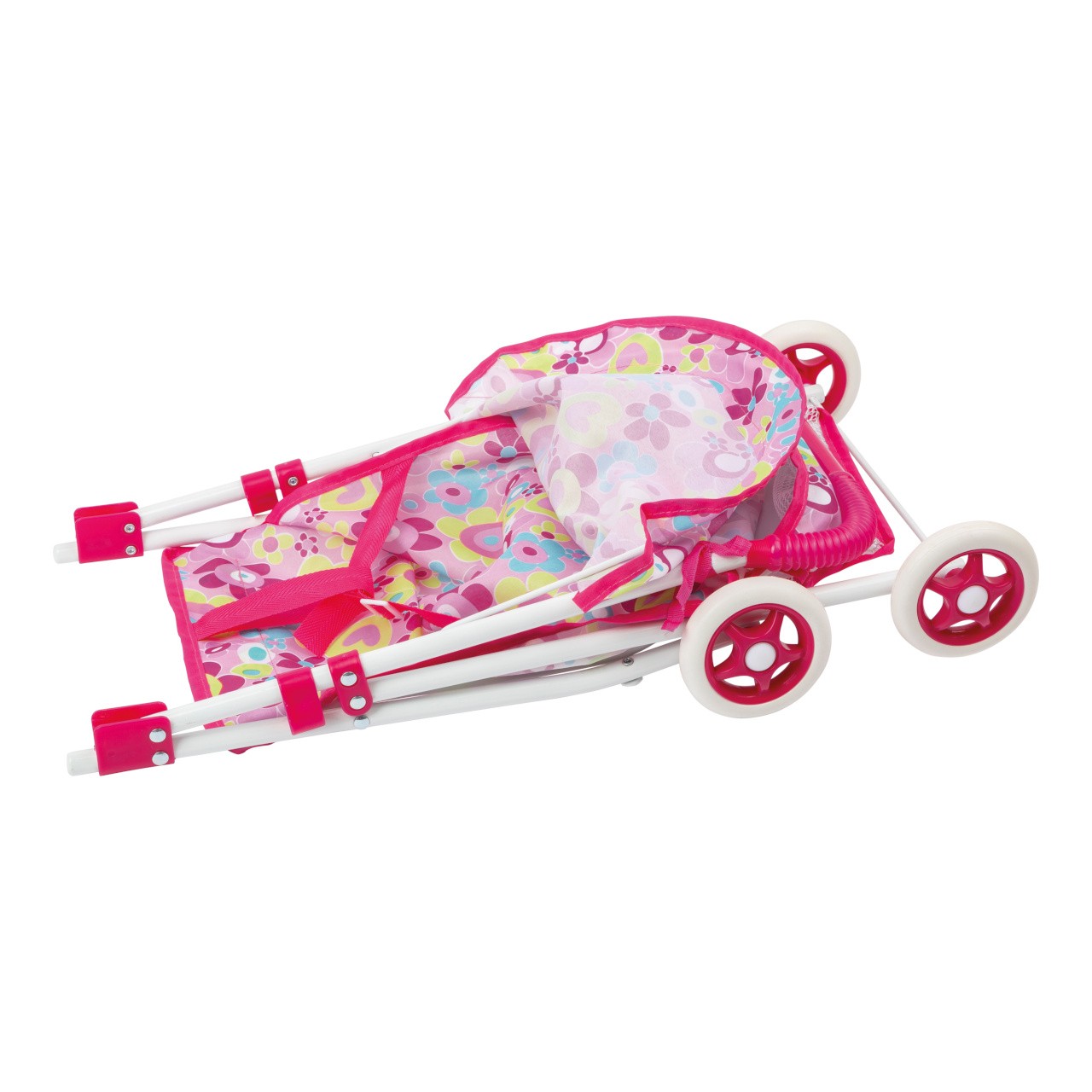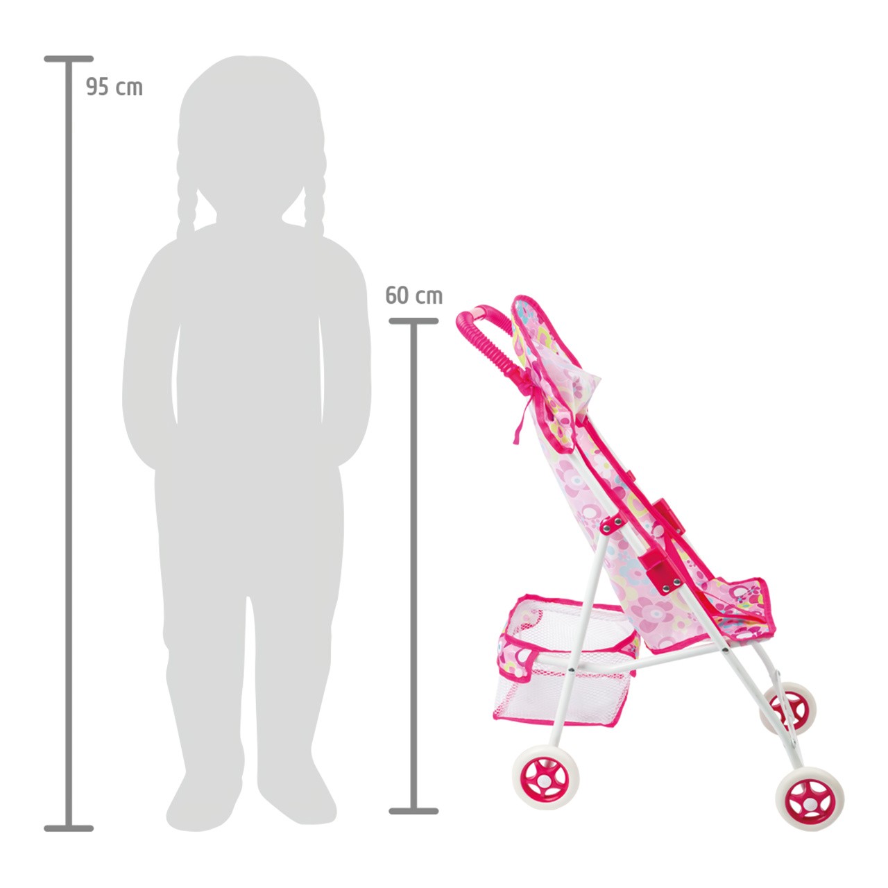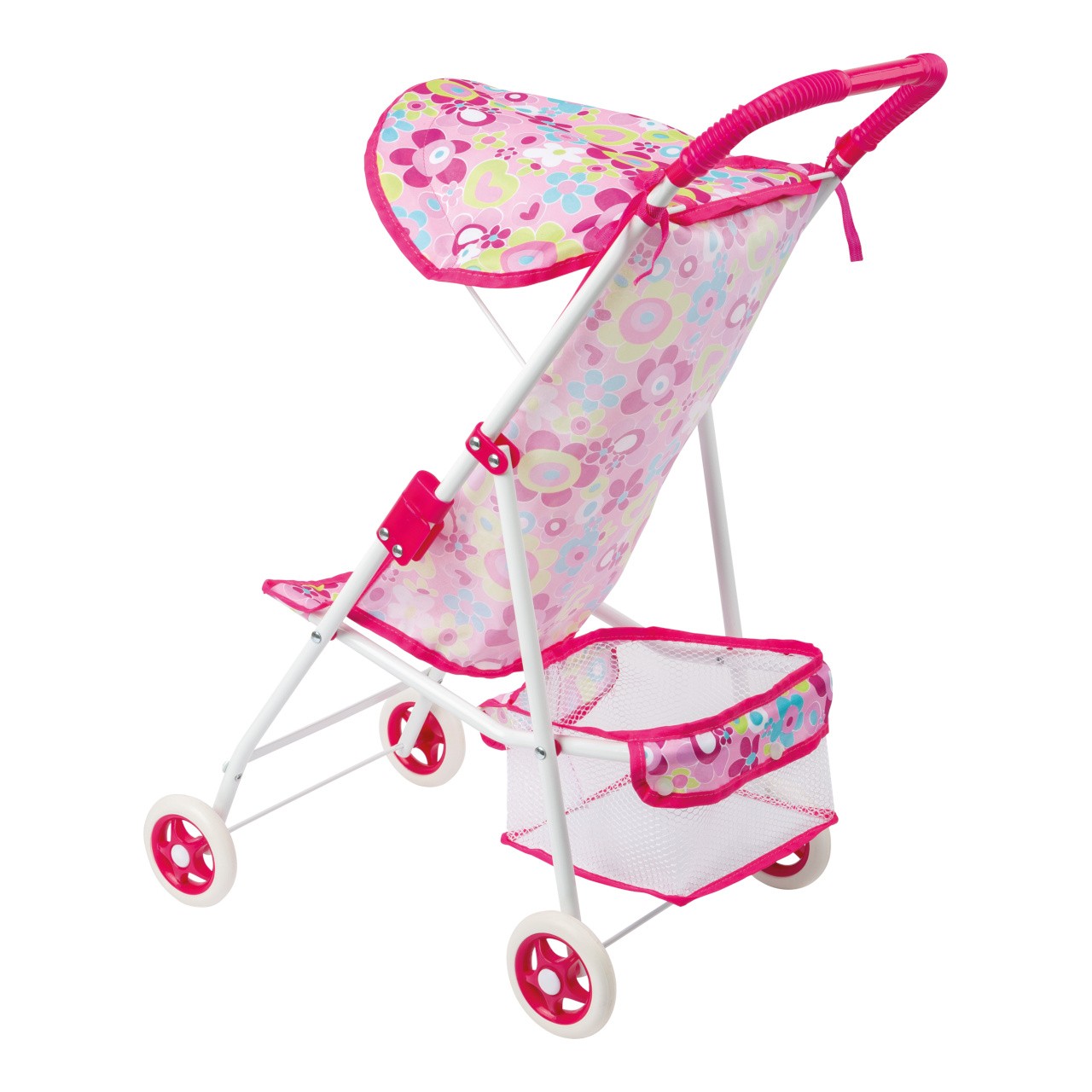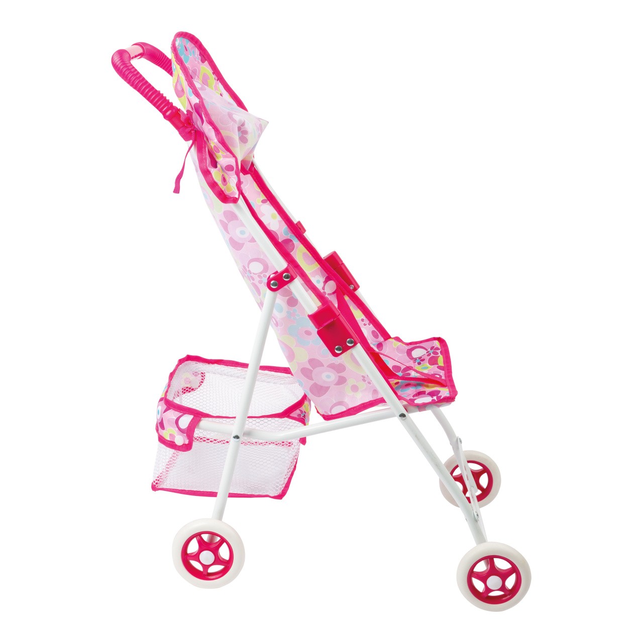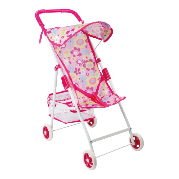 Lehký kočárek pro panenky v moderním designu, který lze díky pogumovaným kolečkům snadno tlačit. Dodává se s prostorným košíkem a sluneční stříškou. Robustní kovový rám je opatřen rychloupínáním a je skládací. Design se může lišit. Ideální pro malé "rodiče" panenek, kteří chtějí chodit na procházky se svými panenkami a plyšovými zvířátky. Hlavní vlastnosti: snadno se skladuje, je lehkýobzvlášť praktický na cestách