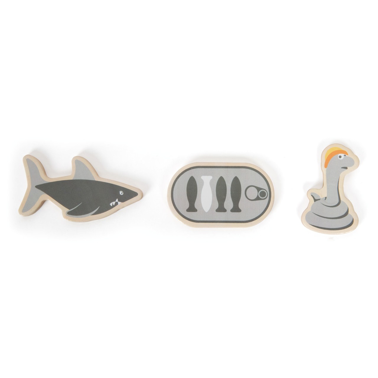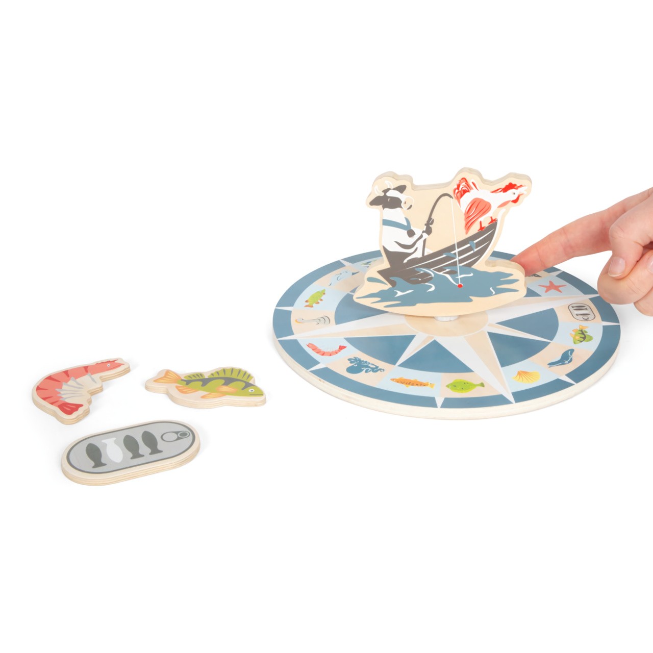 Vydejte se na moře rybařit s roztomilými zvířátky! Roztočte střelku kompasu, a vylosujte si tím mořského tvora, kterého máte ulovit. Chytáním magnetickou udičkou rozvíjejte jemnou motoriku a trpělivost, a to až se třemi přáteli, nebo v kruhu rodiny! Dílky hry jsou vyrobeny z odolné překližky a spolu s udičkami jsou uloženy v praktické, barevně ilustrované kartónové krabičce, která zároveň slouží jako hrací plocha.   Hlavní vlastnosti:4 udičky, 16 herních dílků a 3 díly doplňkůpraktické balení