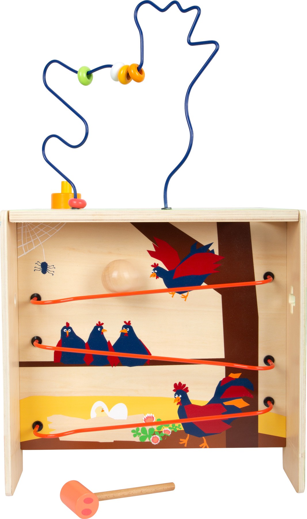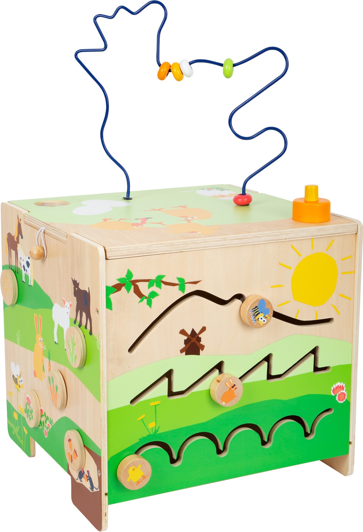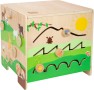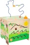 Na vesnici se toho děje opravdu hodně. Korálkový labyrint ve tvaru slepičky, vkládačka, posuvné dílky, hra seřazení barev, zatloukání kladívkem, děti si mohou hrát na všech pěti stranách kostky. Motorická kostka má pěknou ilustraci zvířátek z farmy. Svrchní stranu s labyrintem můžete odvázat a otočit, abyste mohli kostku skladovat bezpečně nebo z ní vytvořili židličku pro děti. Kdo co jí? Ve vkládačce musí děti nakrmit zvířátka správnou potravou. Motorická kostka trénuje poznávání barev a tvarů, také dětem dodá základní informace o zvířatech farmy. Unikátní motorická kostka vyrobená ze dřeva s kovovými prvky. Hlavní vlastnosti Motorické aktivity na pěti stranáchVkládačkaZatloukačkaKorálkový labyrintLze přetransformovat na židličku