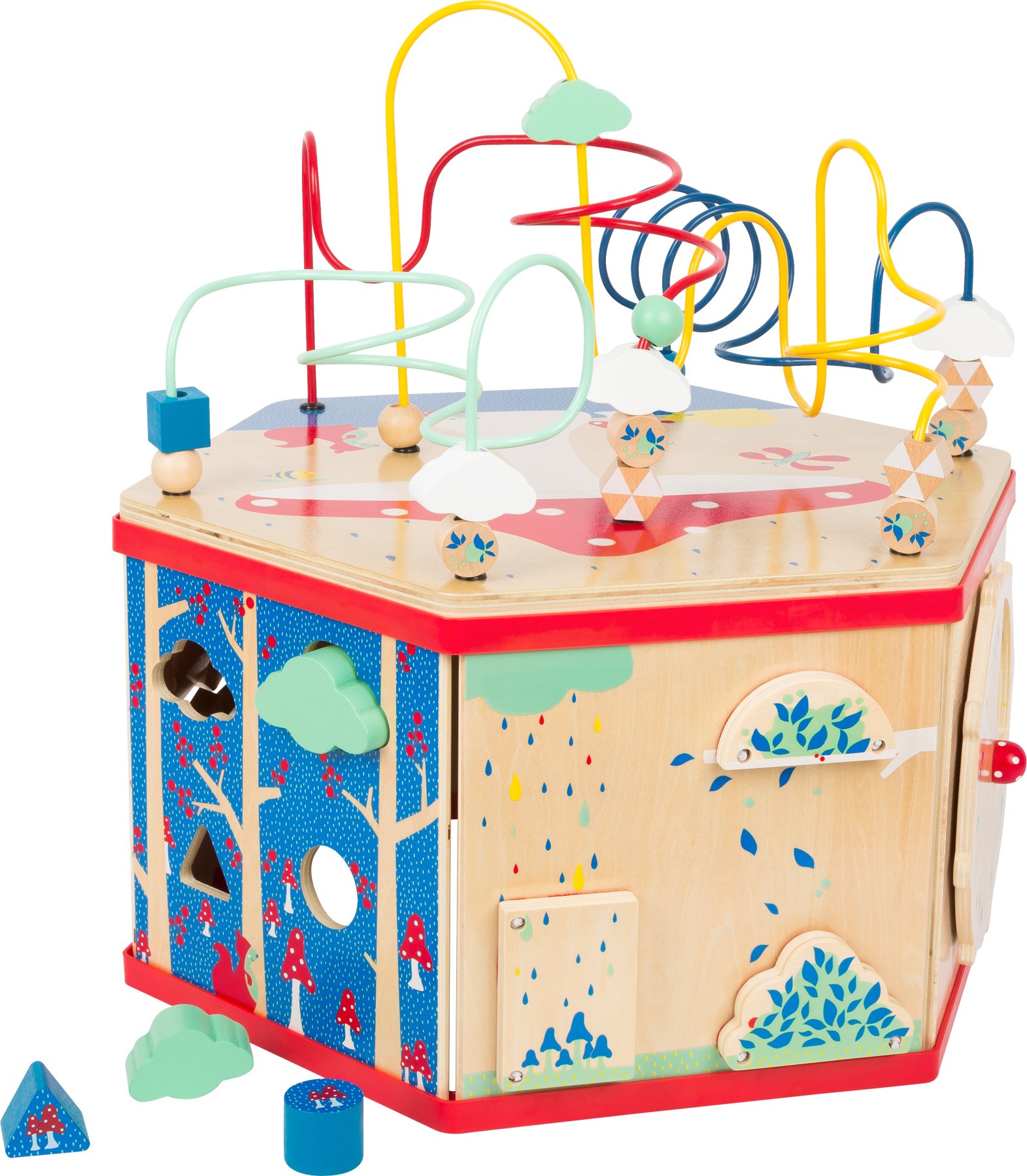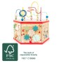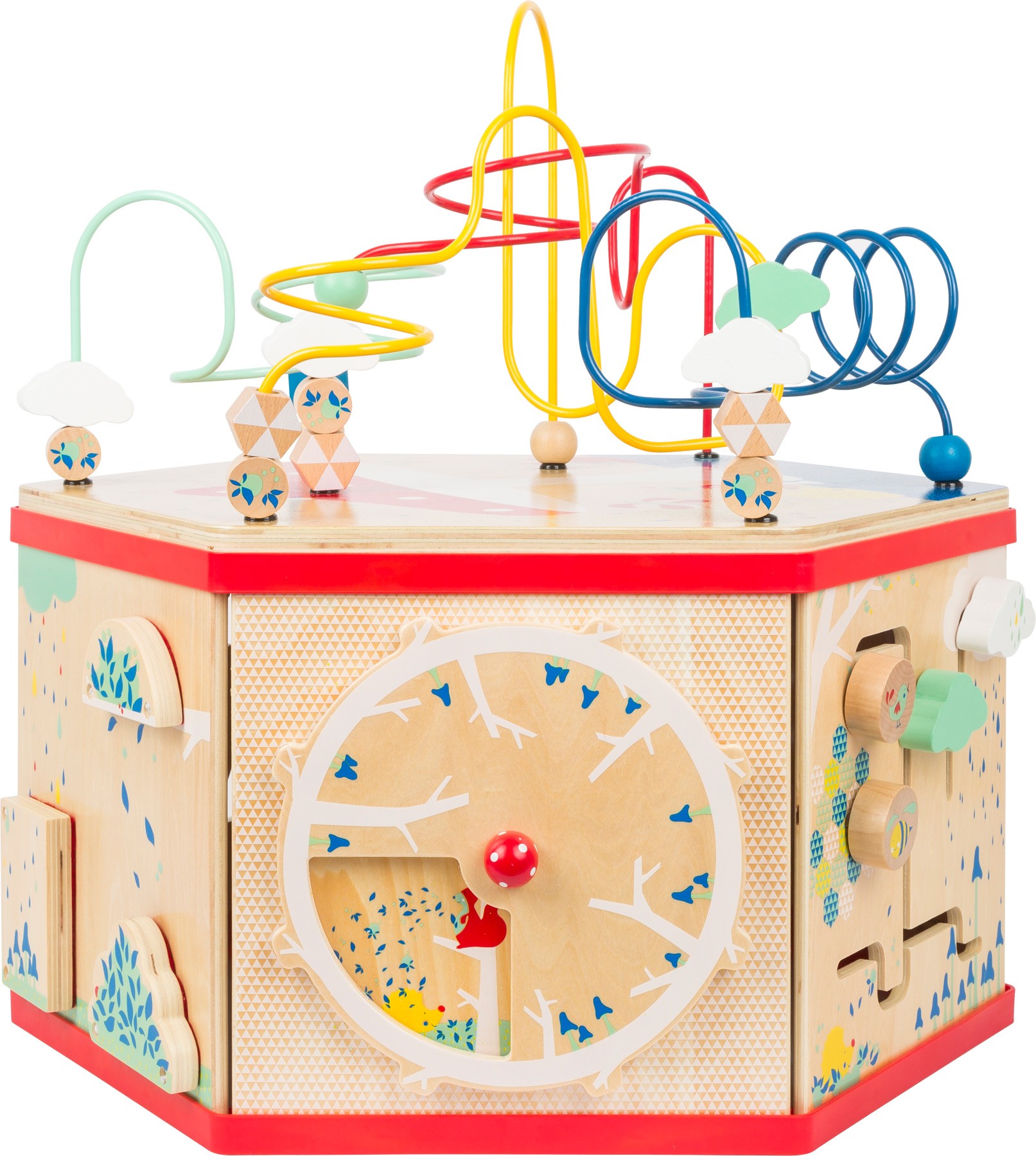 Zábava v exkluzivním designu! Tato kvalitní motorická kostka ze 100% certifikovaného dřeva FSC® ze skupiny produktů „Move it!“ nabízí herní prvky na každé straně kostky. Skládací dřevěné pexeso procvičuje numerické porozumění, zábavná vyhledávací hra s ježky, beruškami a ptáky a sezónní hodiny odhalí zajímavá fakta o jaru, létě, podzimu a zimě. Motorickou kostku doplňuje hra s ozubenými koly a labyrintem. Zábavu završuje velký kovový labyrint na odnímatelném víku. Víko motorické kostky je odnímatelné - při otočení vznikne rovná plocha kterou lze využít v této formě jako stoličku nebo stůl! Hlavní vlastnosti: podporuje jemnou motoriku a logické myšlenípomáhá dětem naučit se rozpoznávání tvarů a barev odjímatelné víko, při jejimž otočení lze motorickou kostku využít jako stůl či stoličkuvyrobeno ze 100% FSC dřeva Značka a certifikát FSC® (Forest Stewardship Council) zaručuje, že dřevo, ze kterého byl produkt vyroben, nebylo vytěženo nelegálně a pochází z lesů obhospodařovaných šetrným či přírodě blízkým způsobem, ve kterém jsou dodržovány přísné environmentální a sociální požadavky. Značka FSC® na výrobku znamená, že svým nákupem pomáháte chránit lesy a podporujete šetrné, odpovědné či přírodě blízké hospodaření, díky kterému jsou naše lesy stabilnější, zdravější, mají přirozenou druhovou skladbu a lépe odolávají negativním následkům klimatických změn.