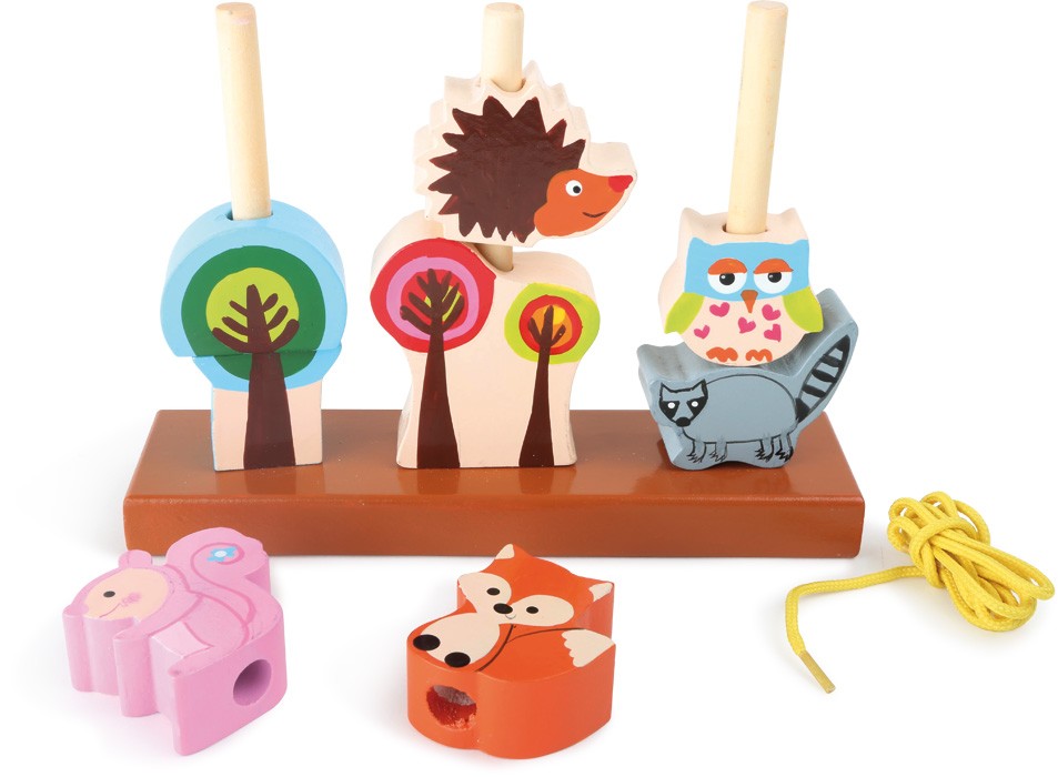 Tato sada umožňuje dílky navléct na šňůrku nebo na dřevěné kolíky. Ježek, liška, veverka, mýval a sova jsou hlavními hrdiny této hry. 3 stromy dotváří lesní atmosféru. Trénink může začít! Hlavní vlastnosti: 8 navlékacích dílů, stojan a šňůrkakompaktní velikost cvičí jemnou motoriku