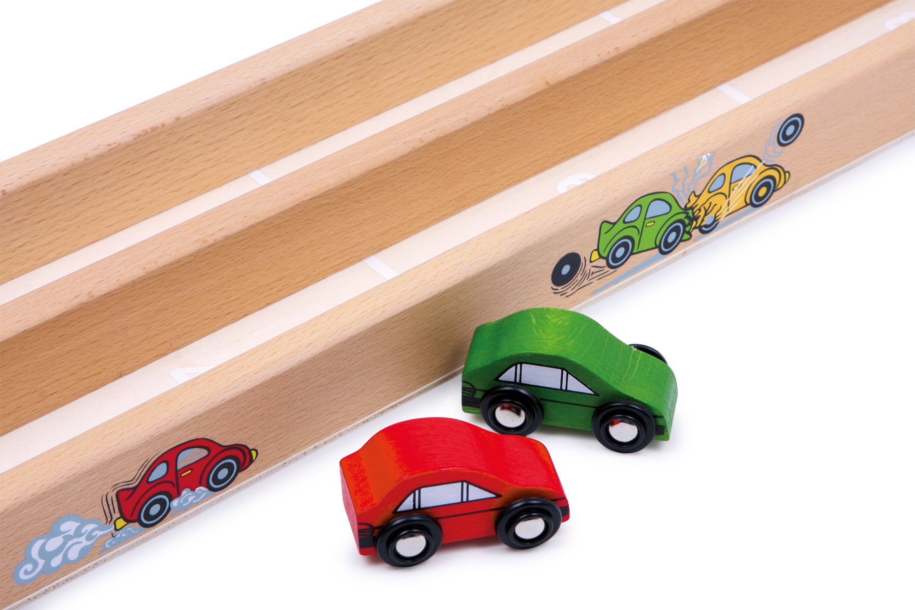 Dlouhá závodní rampa je vybavena odpalováním z gumy. Stačí natáhnout a auto se rozjede a Vy už jen sledujte, kterému autíčku se podařilo vyvinout vyšší rychlost. Po stranách zdobeno barevnými ilustracemi.  Hlavní vlastnosti: rampa se dvěma dráhami2 autíčka součástí balení
