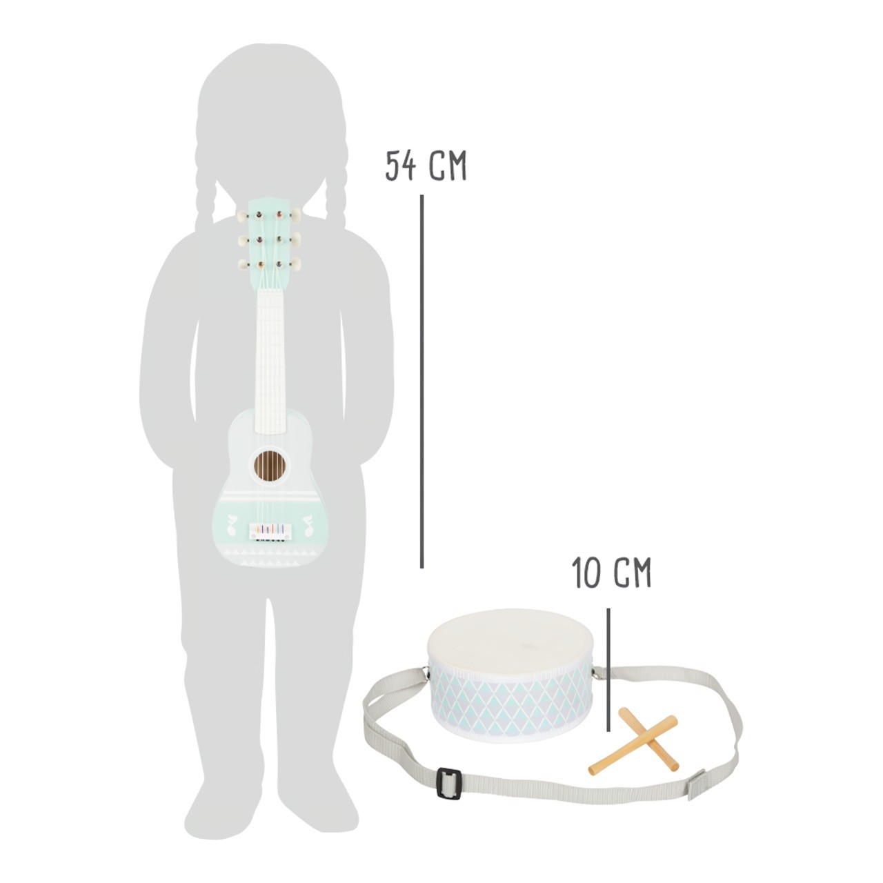 Tento set hudebních nástrojů se skládá z kytary, xylofonu a bubnu v pastelových barvách. Tři hudební nástroje v krásnem designu promění dětský pokoj v koncertní sál. S touto hračkou mohou děti získat první zkušenosti s rytmem a zvukem, podporuje také dětskou kreativitu. Hlavní vlastnosti: jemné pastelové barvykytara, xylofon s dvojící vlastních paliček a bubínek s dvojicí vlastních paliček