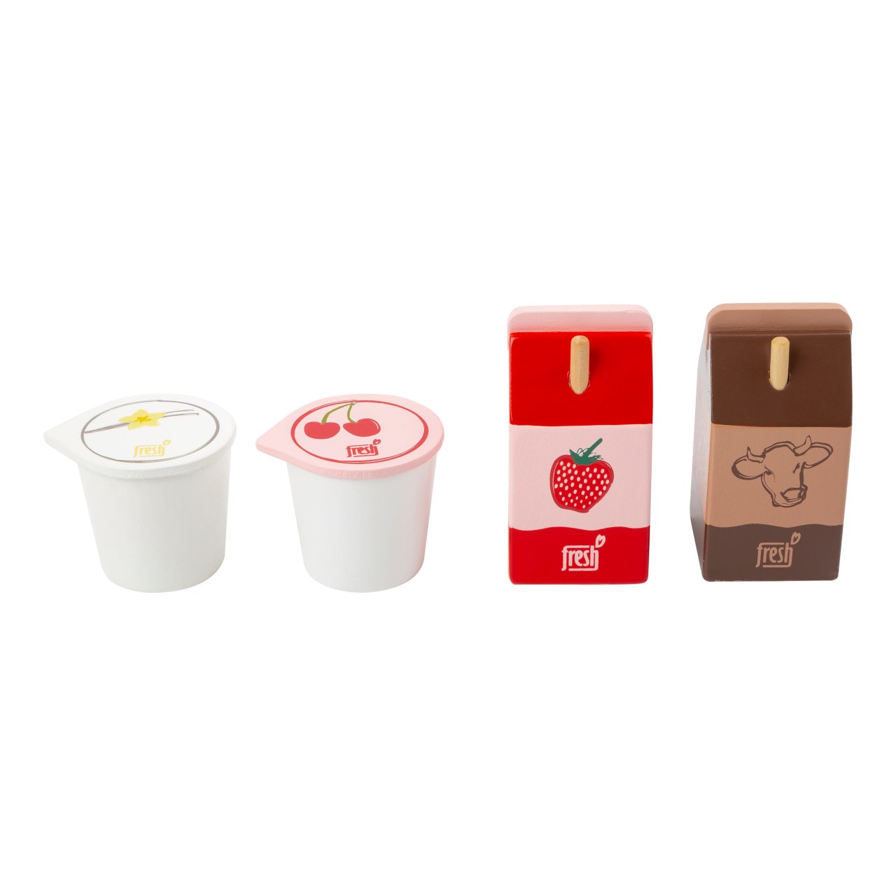 Z lednice rovnou do nákupního košíku. Tyto čtyři dřevěné mléčné produkty jsou ideálním doplňkem dětských kuchyněk nebo prodejních stánků. Kromě jahodového je zde i kakaové mléko, obě s brčkem. Sada dále obsahuje maketu vanilkového a třešňového jogurtu. Realistická hračka, která se dětem bude určitě líbit. Pevné dřevo zaručuje dlouhotrvající kvalitu. Hlavní vlastnosti: sada obsahuje 4 kshračka podporuje hraní rolí